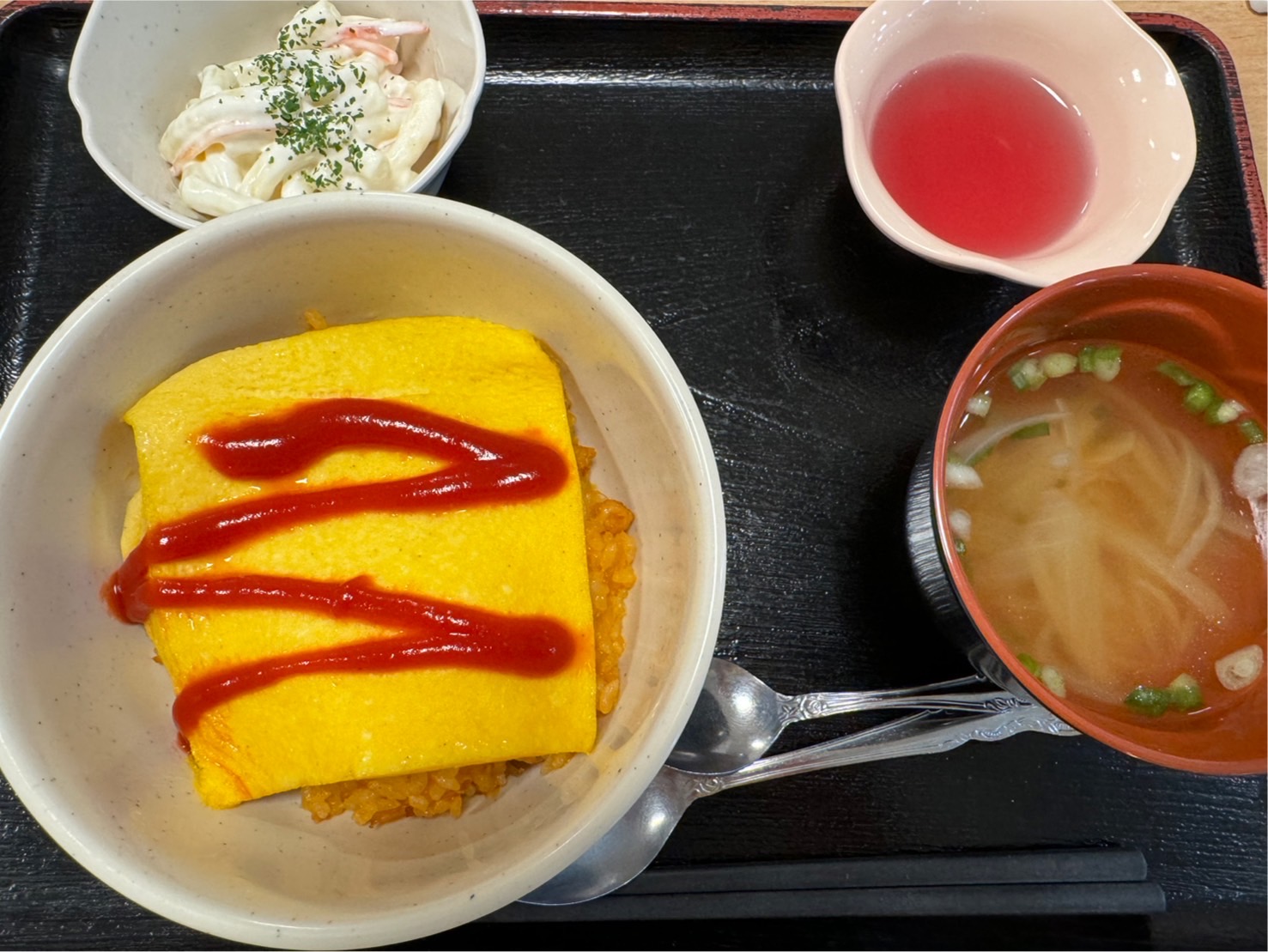 【昼食】 1.オム丼 2.マカロニサラダ 3.手作りゼリー 4.コンソメスープ