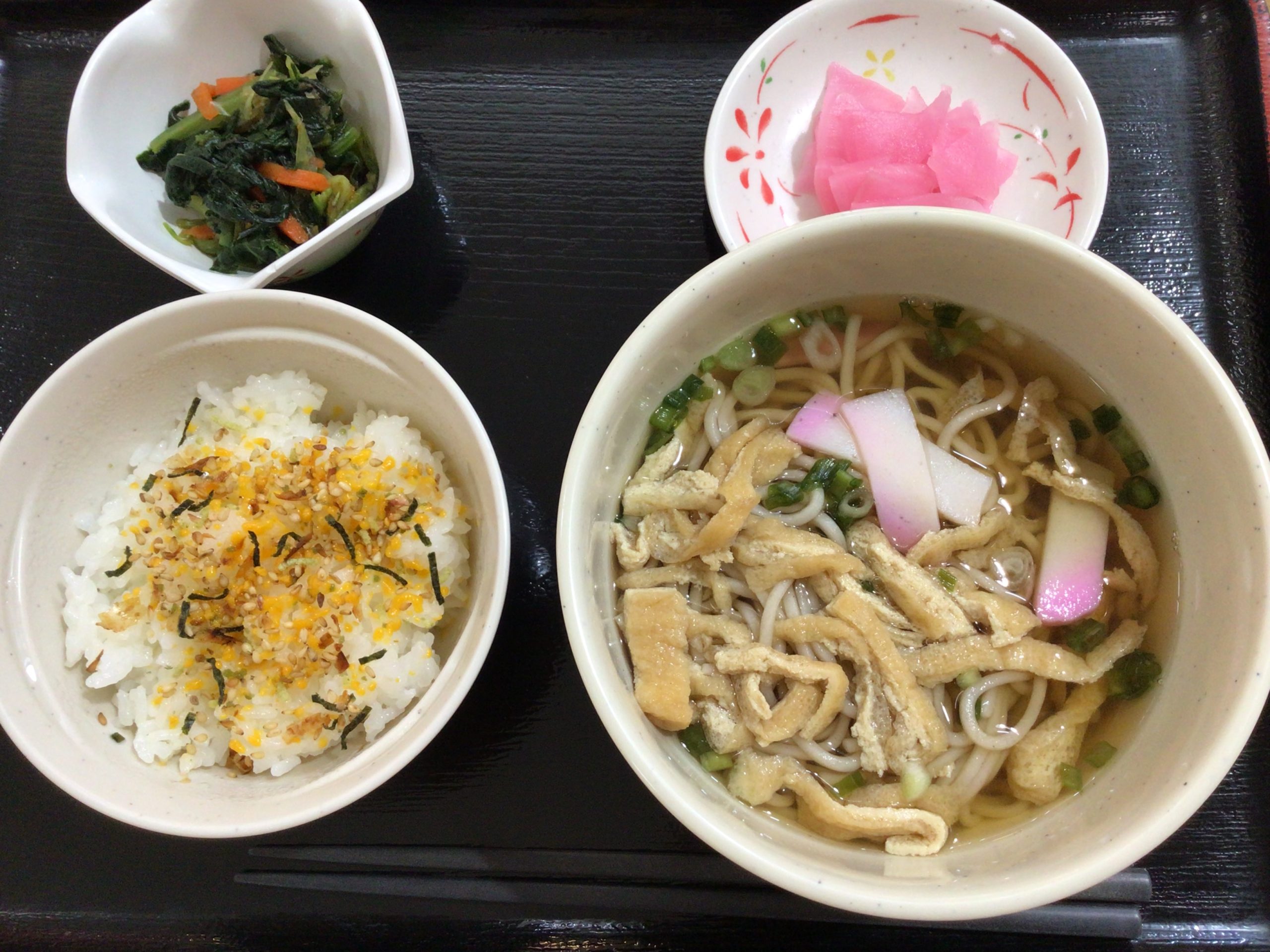 【昼食】 1.ゆかりご飯(小) 2.たぬきそば 3.高野豆腐の煮物 4.漬物