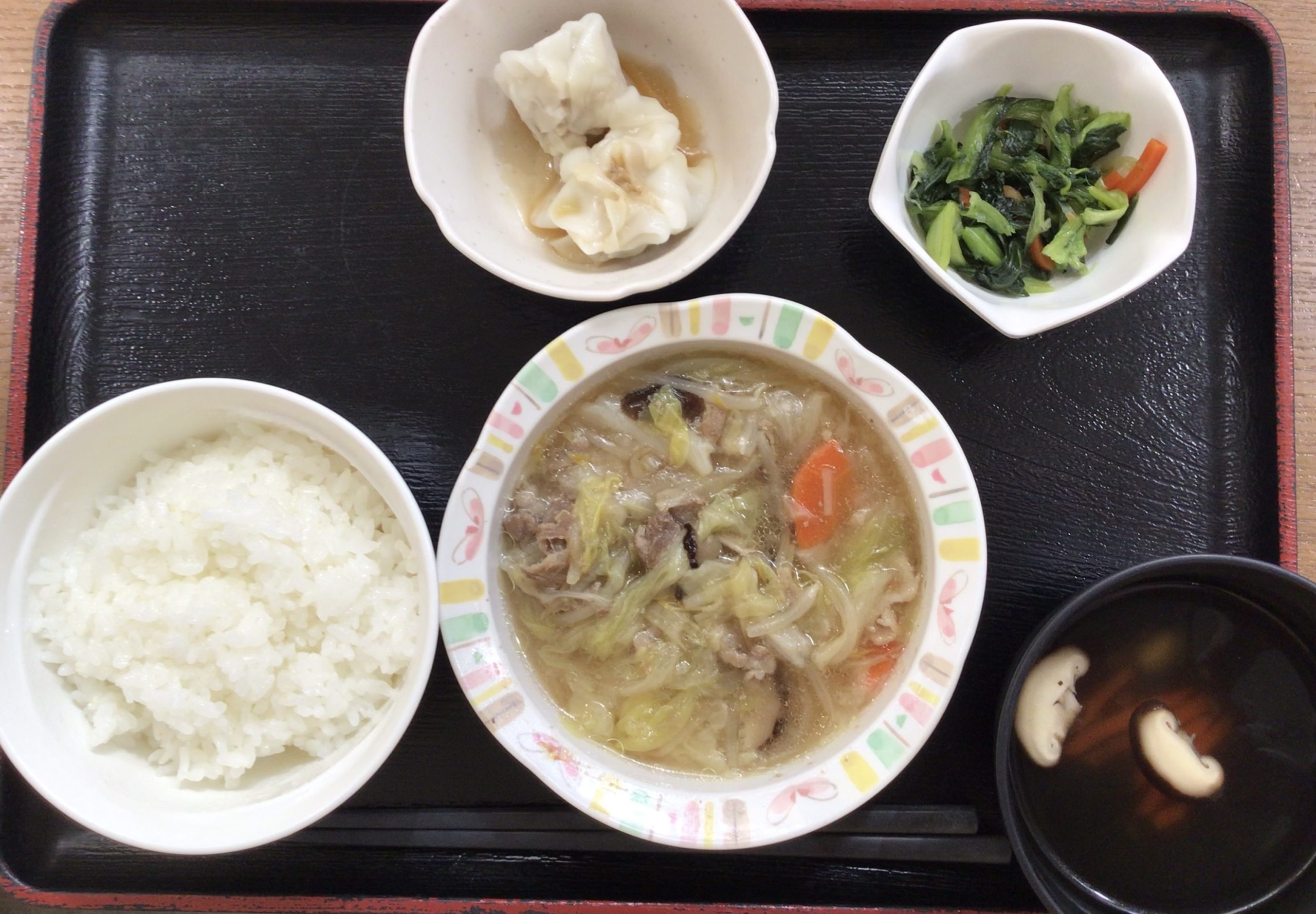 【昼食】 1.ご飯 2.八宝菜 3.小松菜のナムル 4.蒸しシューマイ 5.中華風スープ