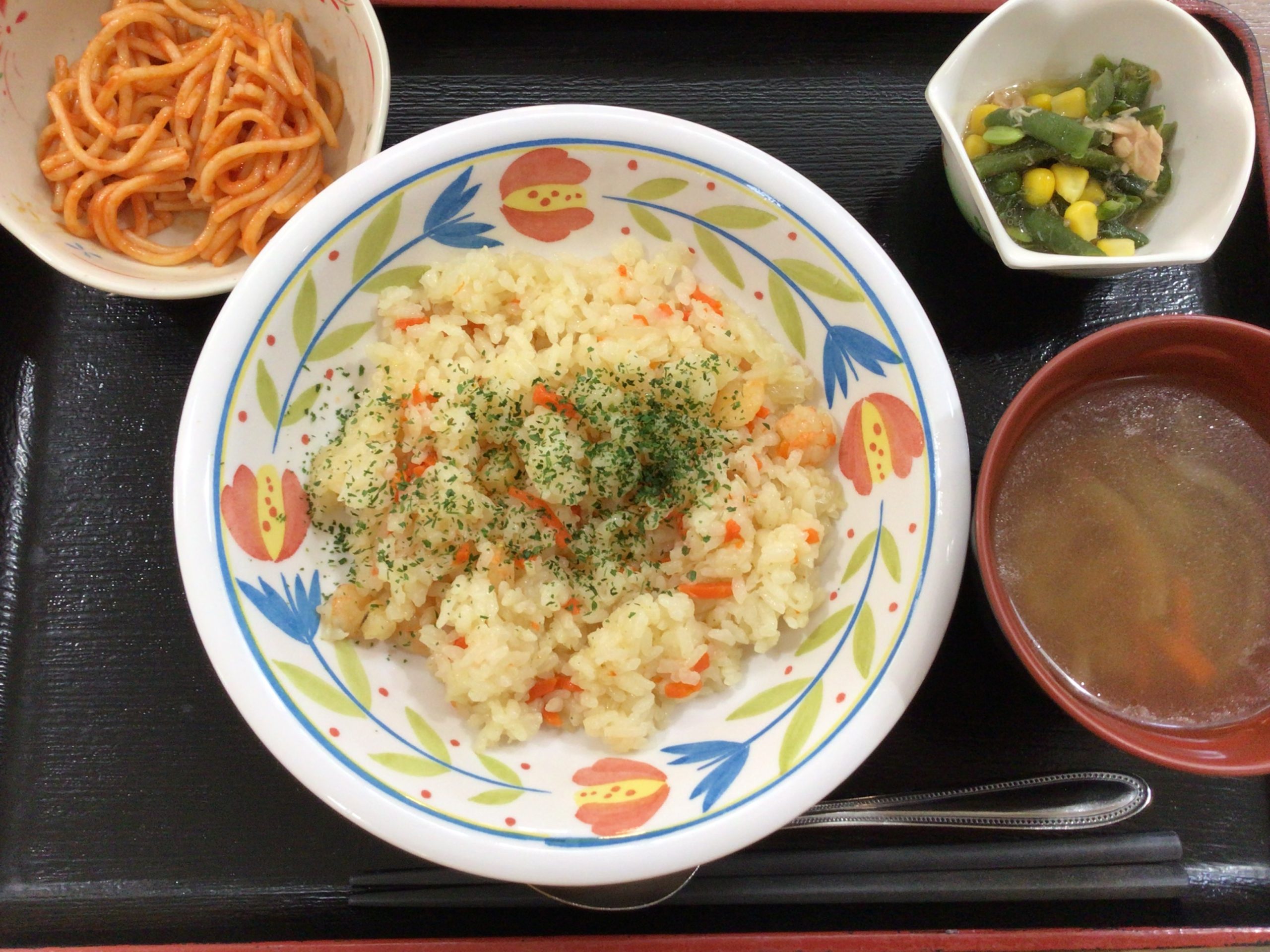 【昼食】 1.炊き込みエビピラフ 2.ナポリタン 3.いんげんのサラダ 4.コンソメスープ