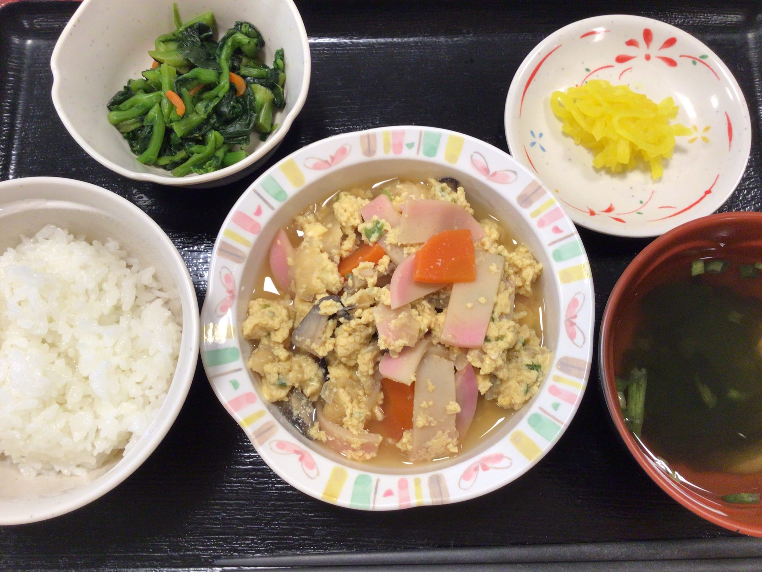 【昼食】 1.ご飯 2.木の葉とじ 3.菜の花のお浸し 4.漬物 5.すまし汁