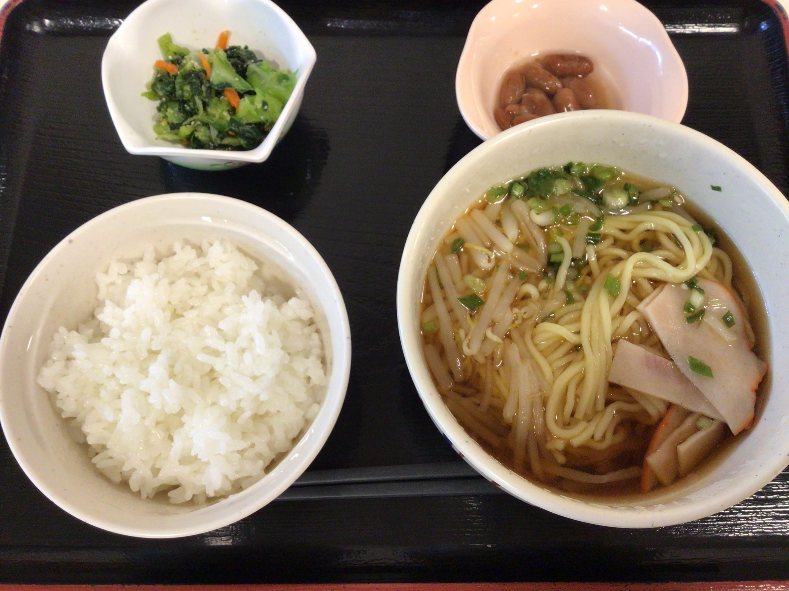 【昼食】 1.ご飯(小) 2.醤油ラーメン 3.ナムル 4.金時豆