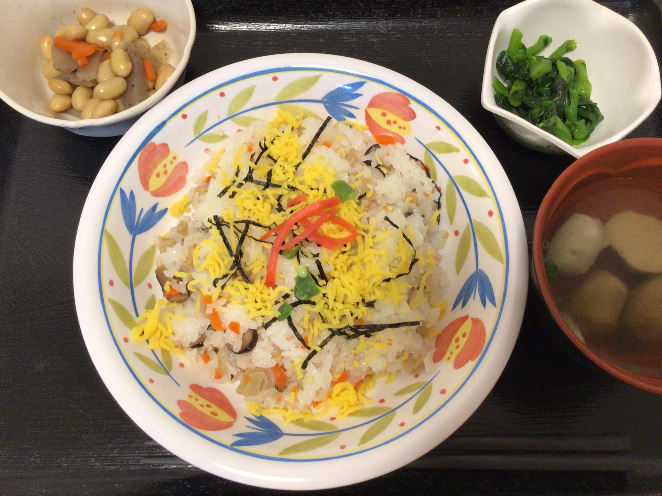 【昼食】 1.五目ちらし寿司 2.大豆煮 3.菜の花の辛子和え 4.いわしつみれ汁