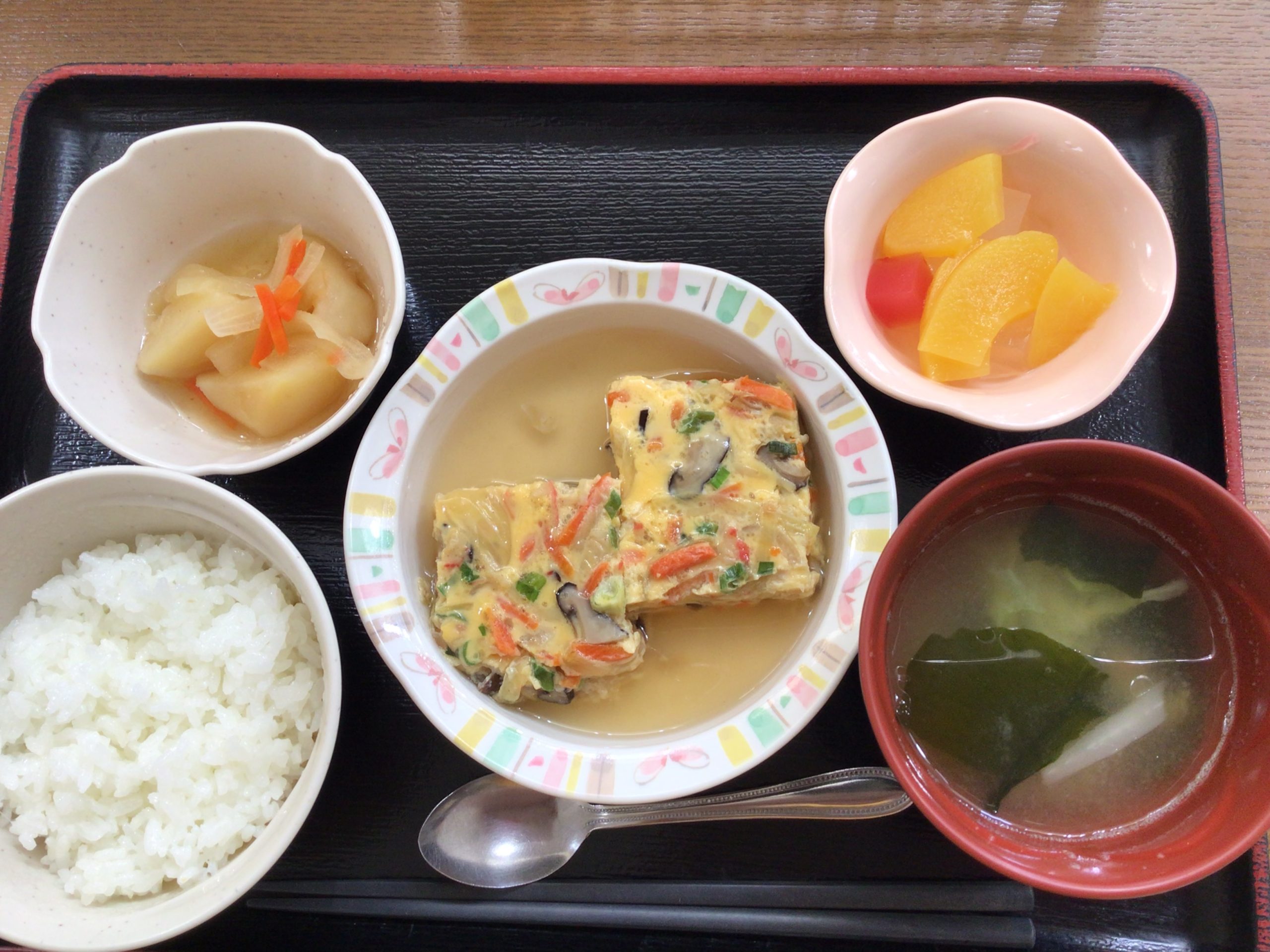 【昼食】 1.ご飯 2.かに玉風 3.じゃがいもの煮物 4.フルーツ寒天 5.みそ汁