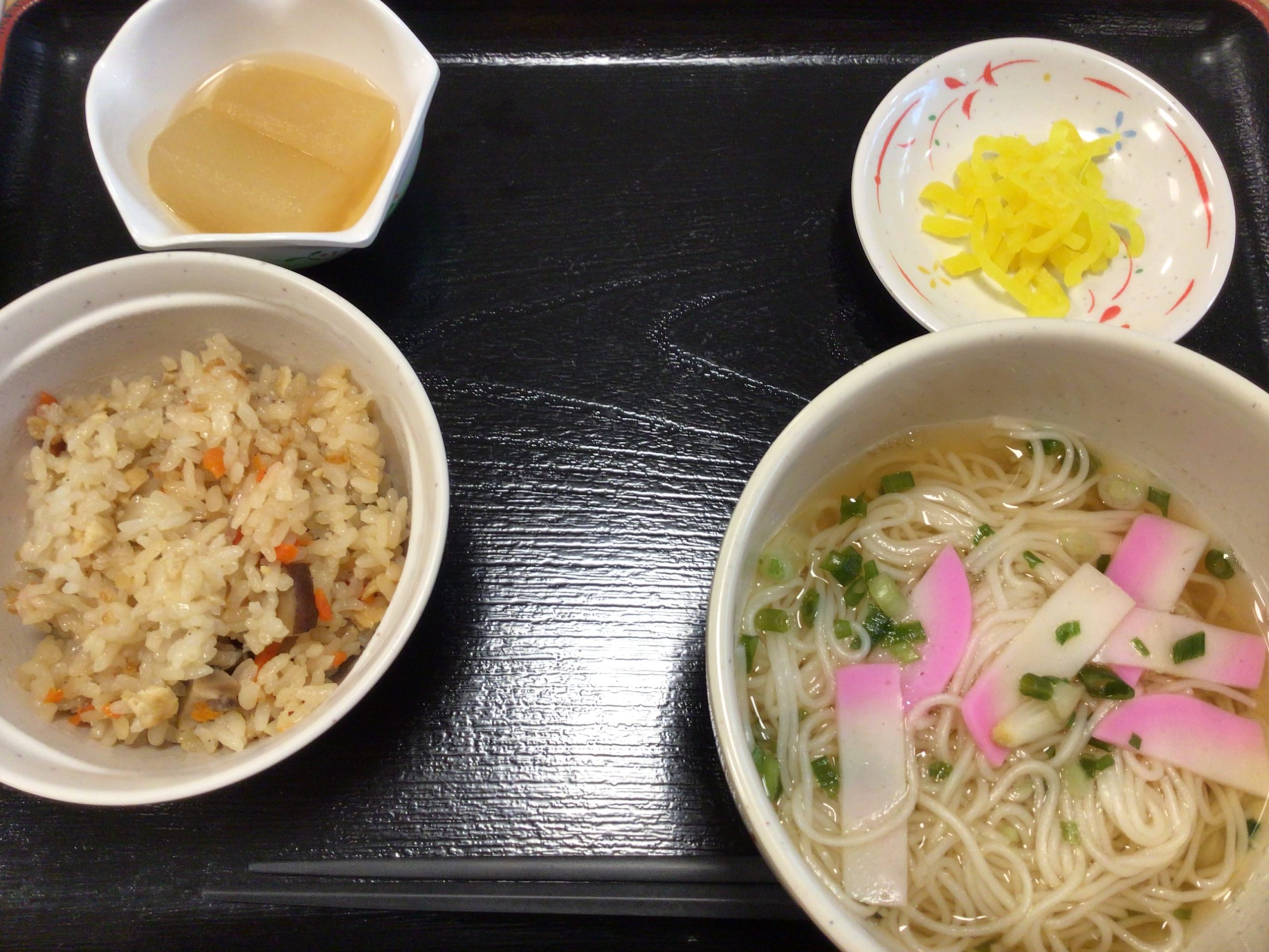 【昼食】 1.炊き込みご飯(小) 2.にゅう麺 3.冬瓜生姜煮 4.漬物