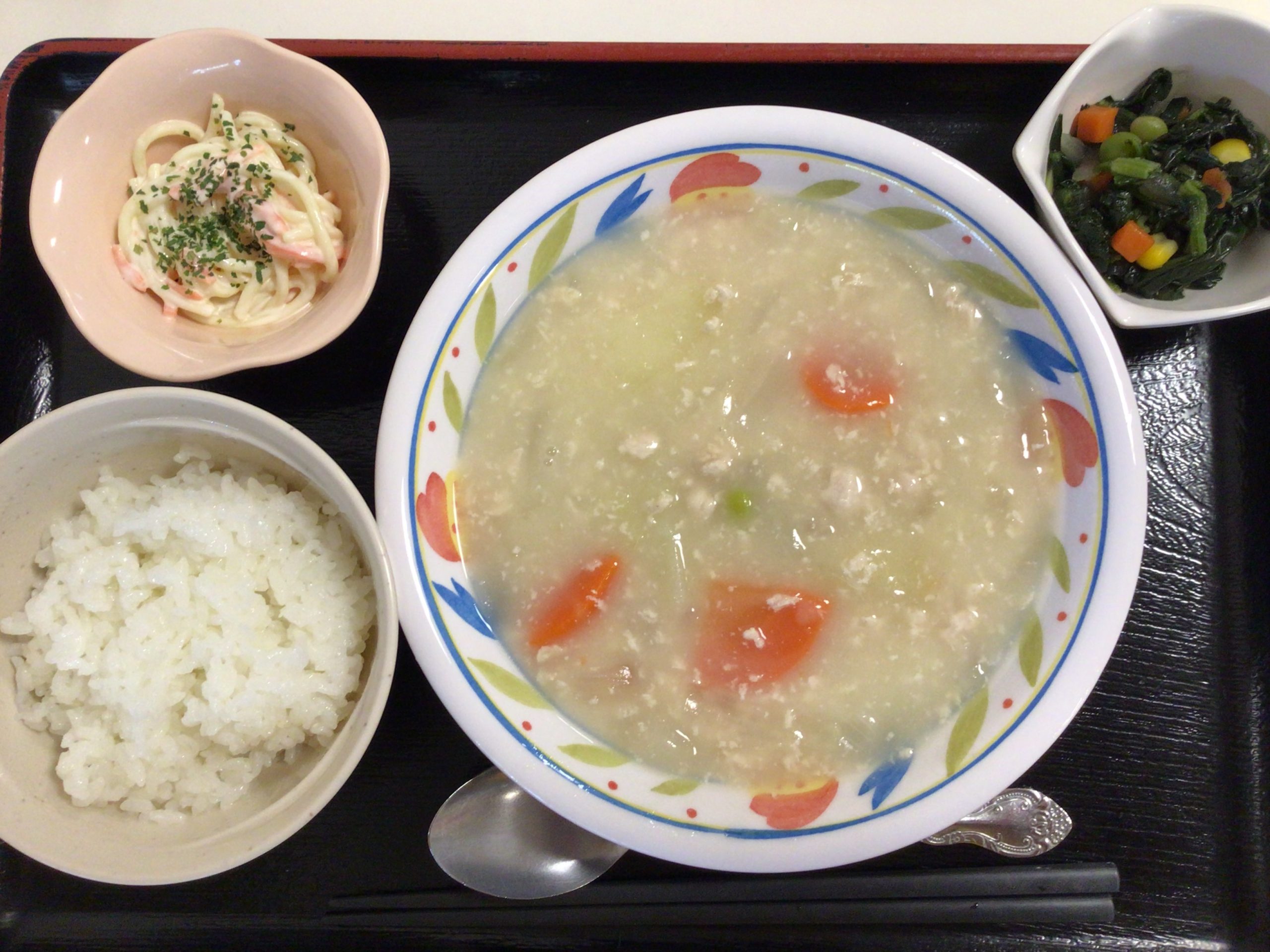 【昼食】 1.ご飯 2.クリームシチュー 3.ほうれん草の炒め物 4.スパゲティサラダ