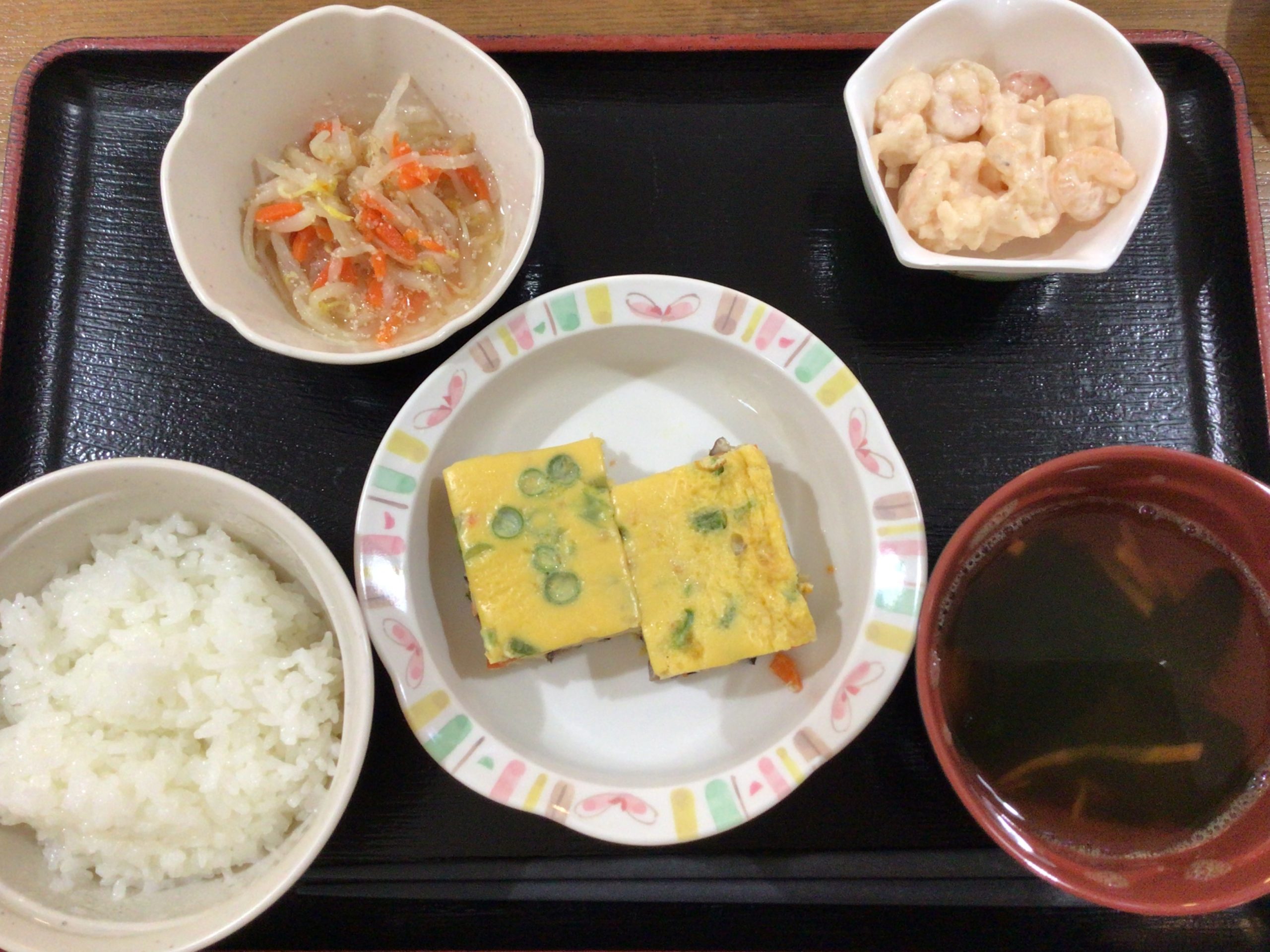 【昼食】 1.ご飯 2.千草焼き 3.オーロラサラダ 4.もやしの胡麻酢和え 5.すまし汁