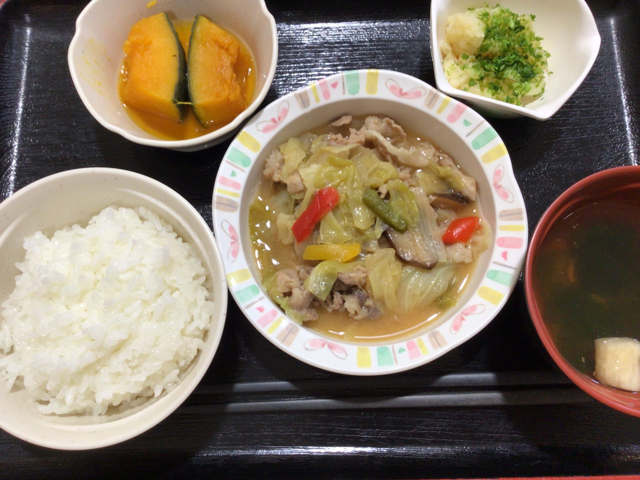 【昼食】 1.ご飯 2.豚と野菜のみそ炒め 3.かぼちゃの含め煮 4.カリフラワーのりまぶし 5.すまし汁