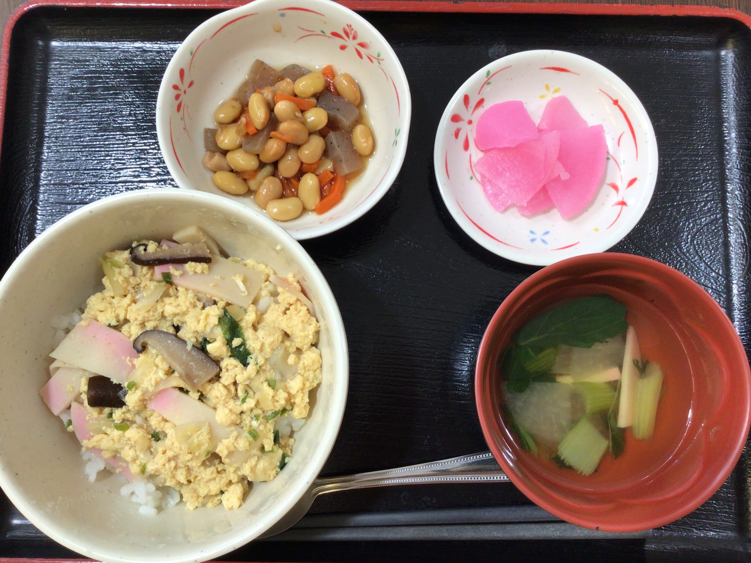 【昼食】 1.木の葉丼 2.大豆煮 3.漬物 4.すまし汁