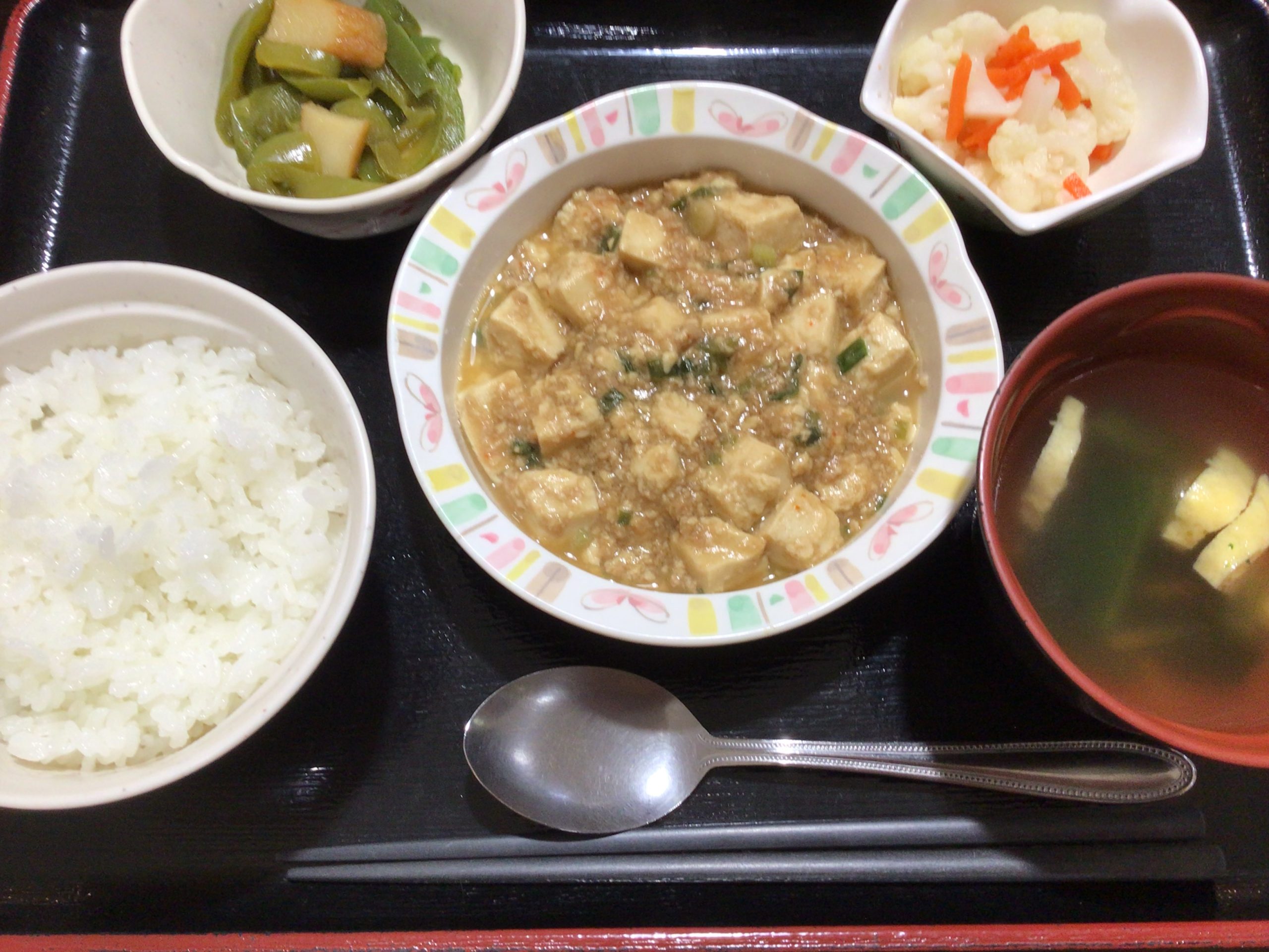 【昼食】 1.ご飯 2.麻婆豆腐 3.ピーマンの甘辛煮 4.カリフラワーの甘酢和え 5.中華風スープ