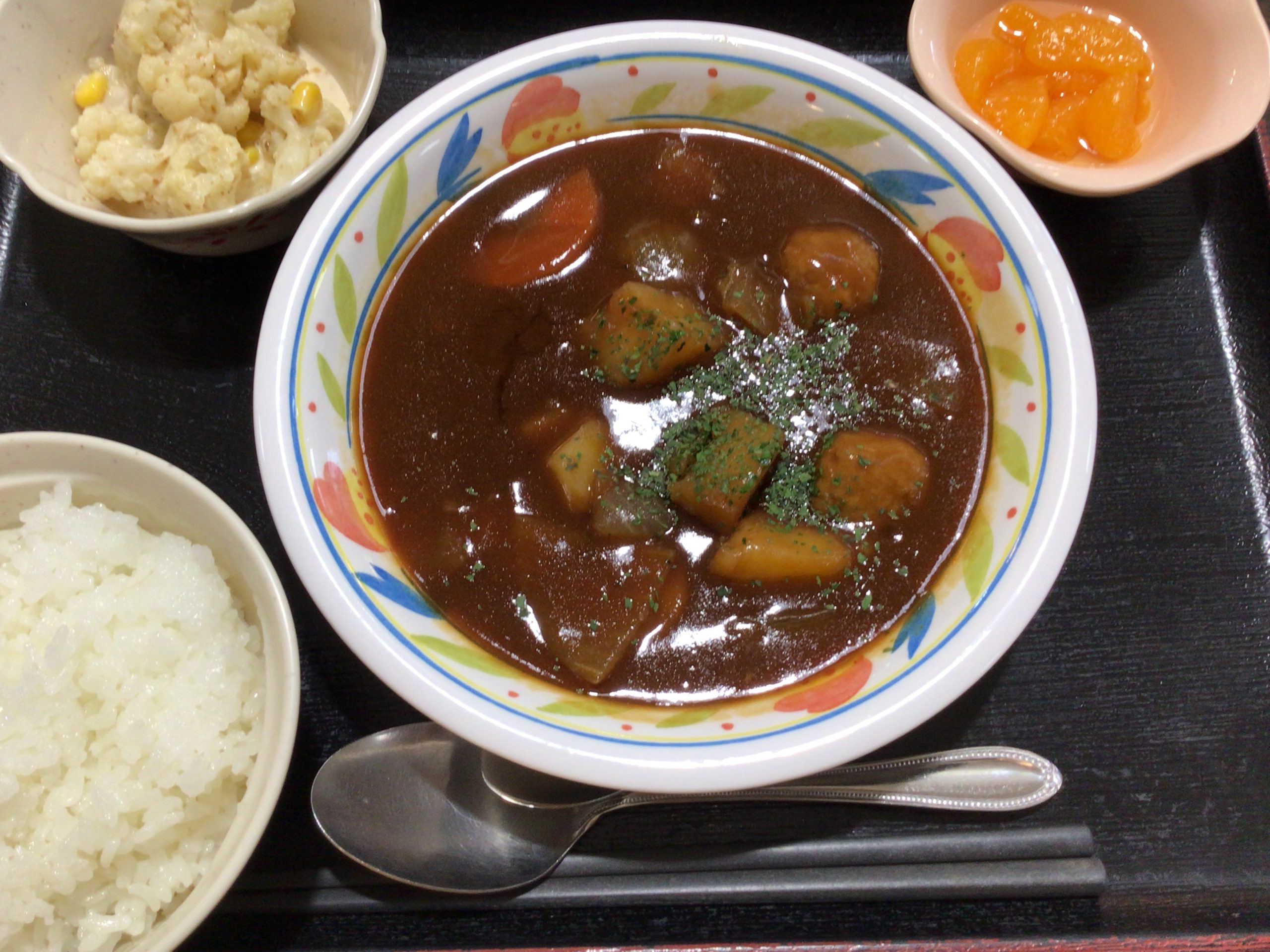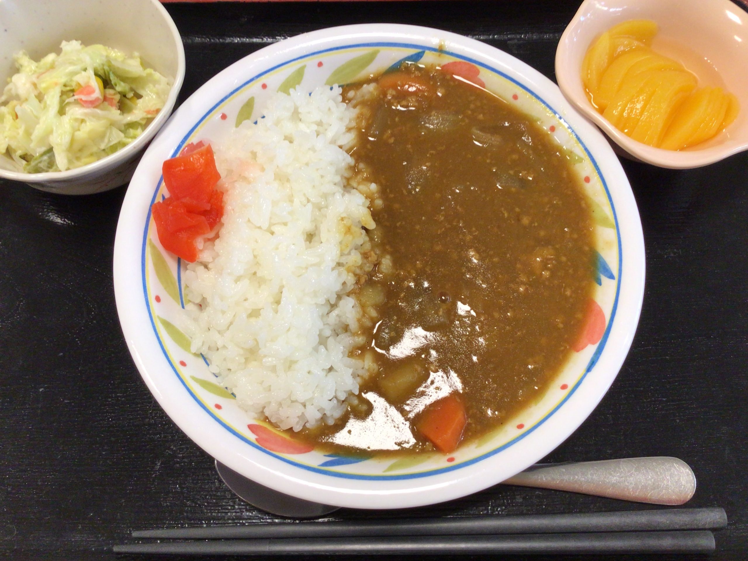 【昼食】 1.カレーライス 2.福神漬け 3.コールスローサラダ 4.フルーツ缶