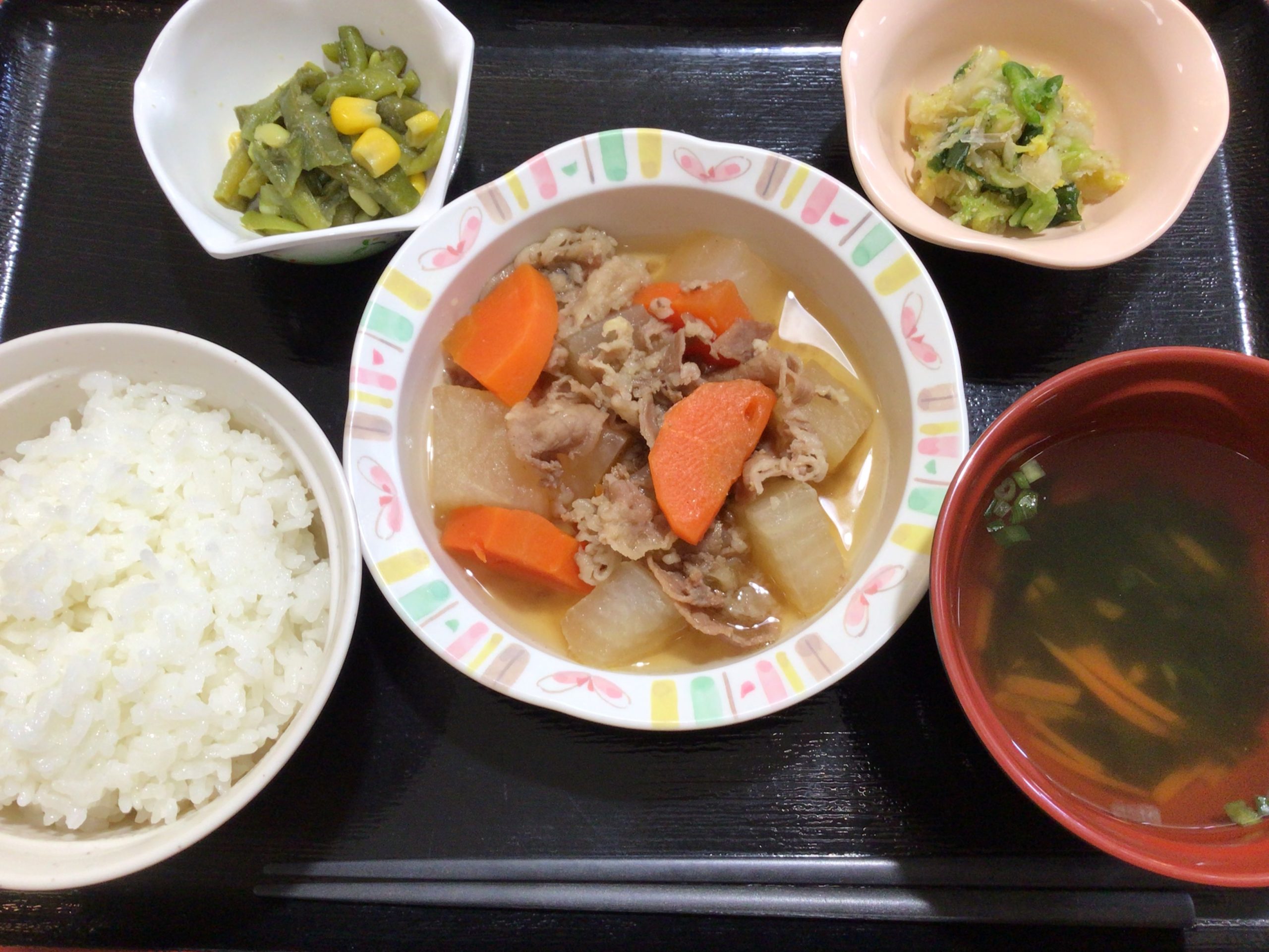【昼食】 1.ご飯 2.牛肉と大根の煮物 3.いんげんとコーンのソテー 4.白菜のごま和え 5.すまし汁
