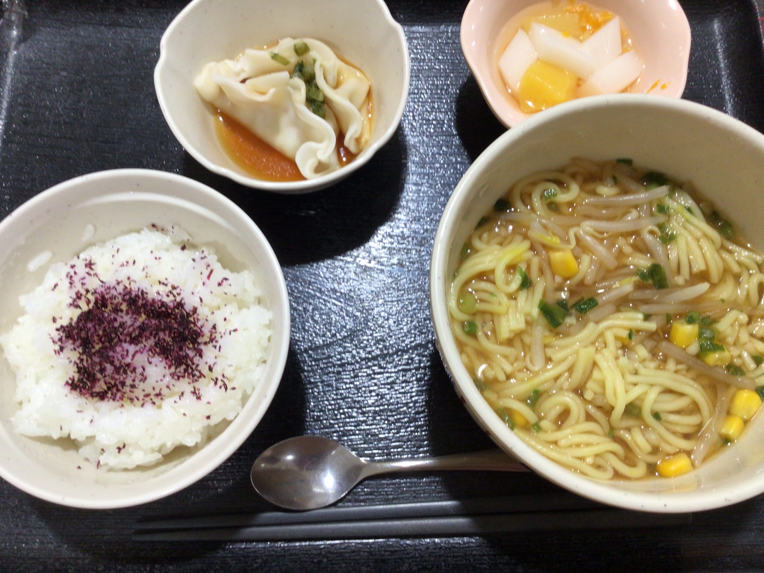 【昼食】 1.ゆかりご飯(小) 2.味噌ラーメン 3.水餃子ねぎポン酢 4.フルーツ杏仁豆腐