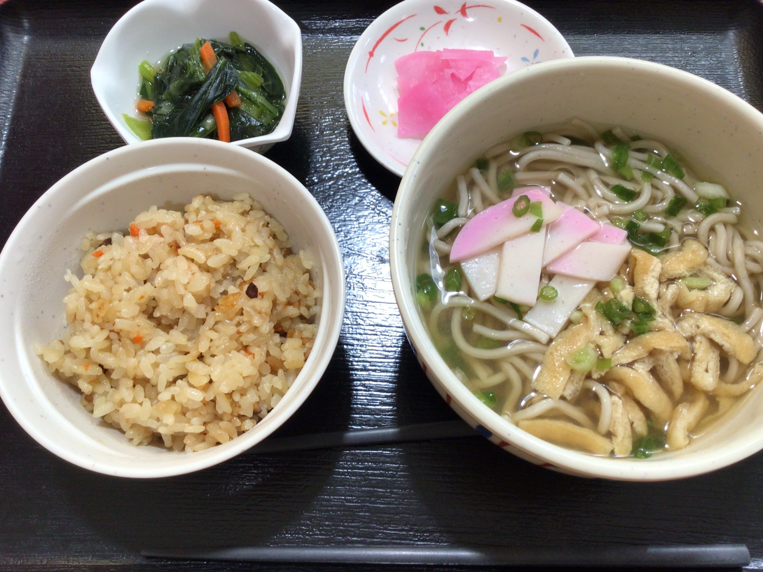 【昼食】 1.炊き込みご飯(小) 2.きざみそば 3.青梗菜の煮びたし 4.漬物