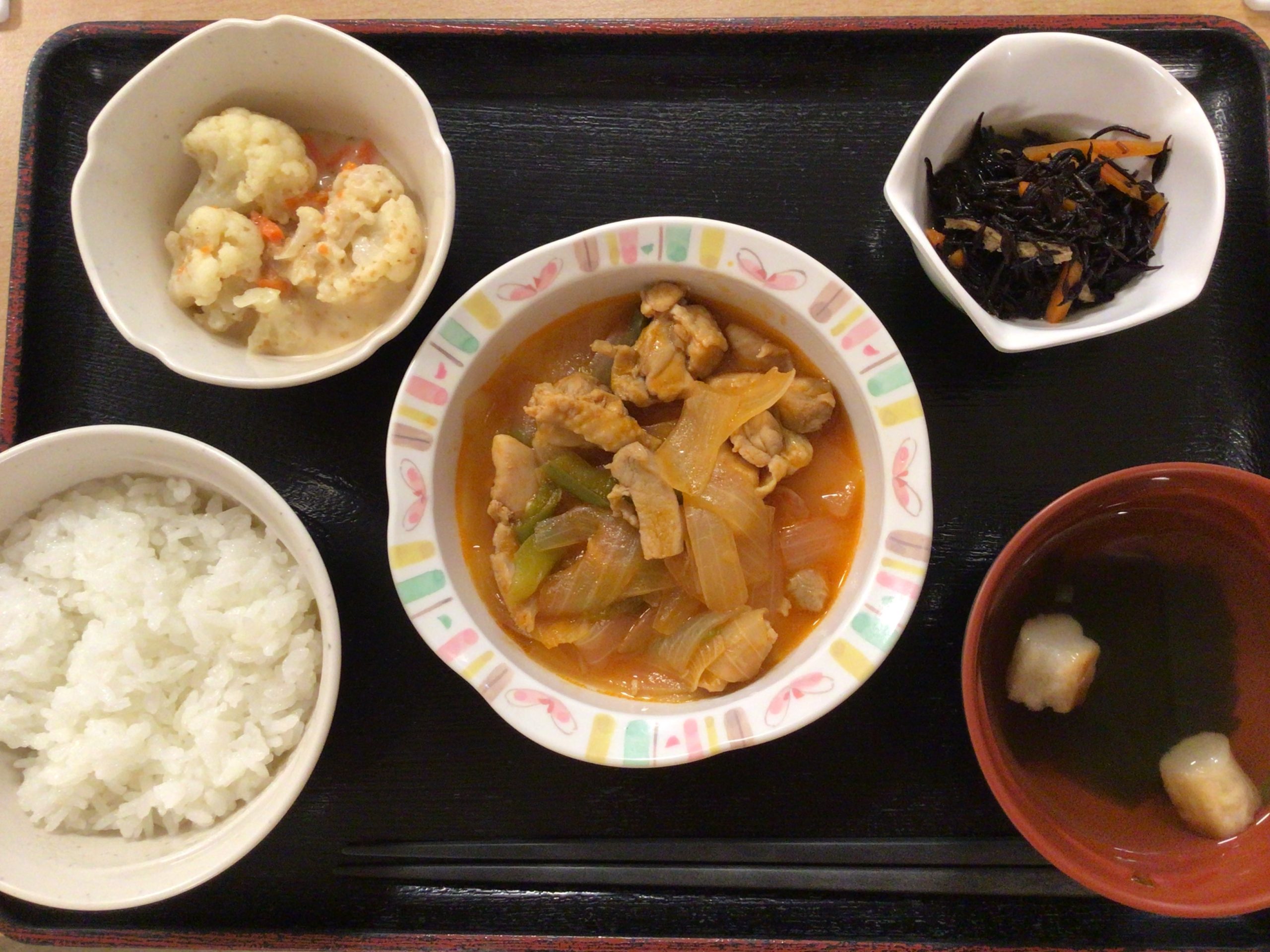 【昼食】 1.ご飯 2.チキンチャップ 3.カリフラワーごまドレ和え 4.ひじき煮 5.すまし汁