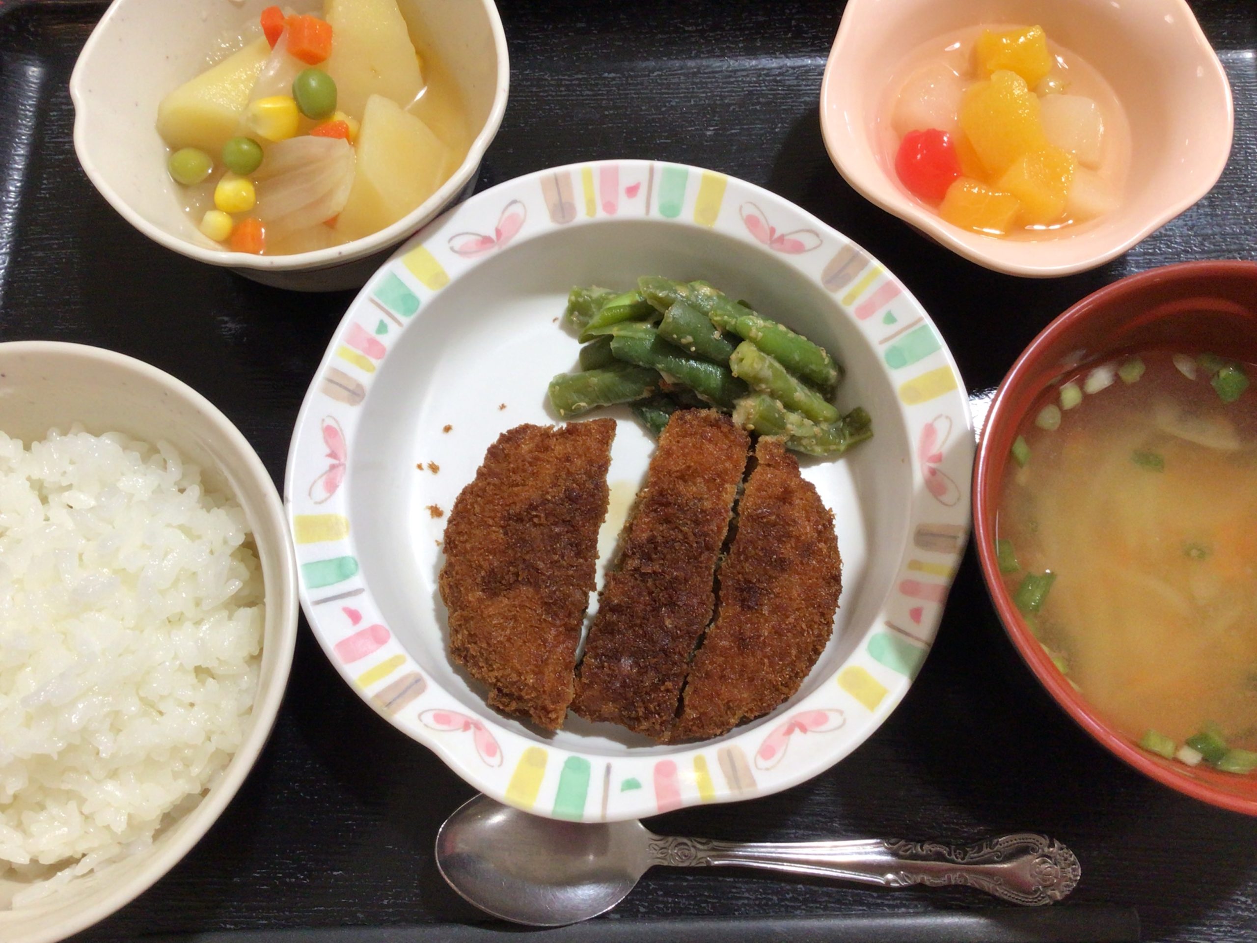 【昼食】 1.ご飯 2.メンチカツ いんげん胡麻マヨ和え添 3.じゃがいものコンソメ煮 4.フルーツカクテル 5.みそ汁