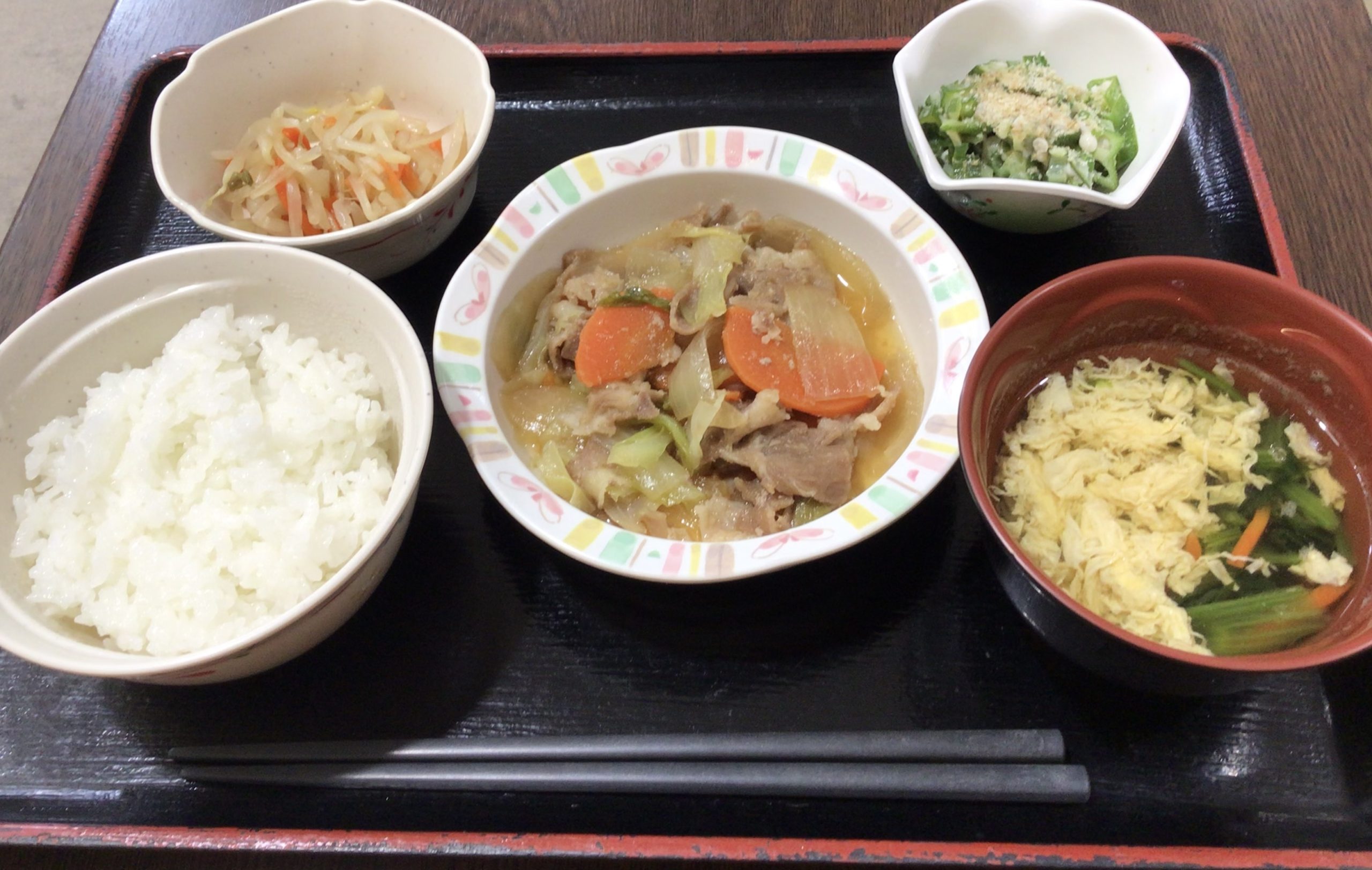 【昼食】 1.ご飯 2.豚肉の生姜炒め 3.もやしお浸し 4.オクラドレッシング和え 5.すまし汁