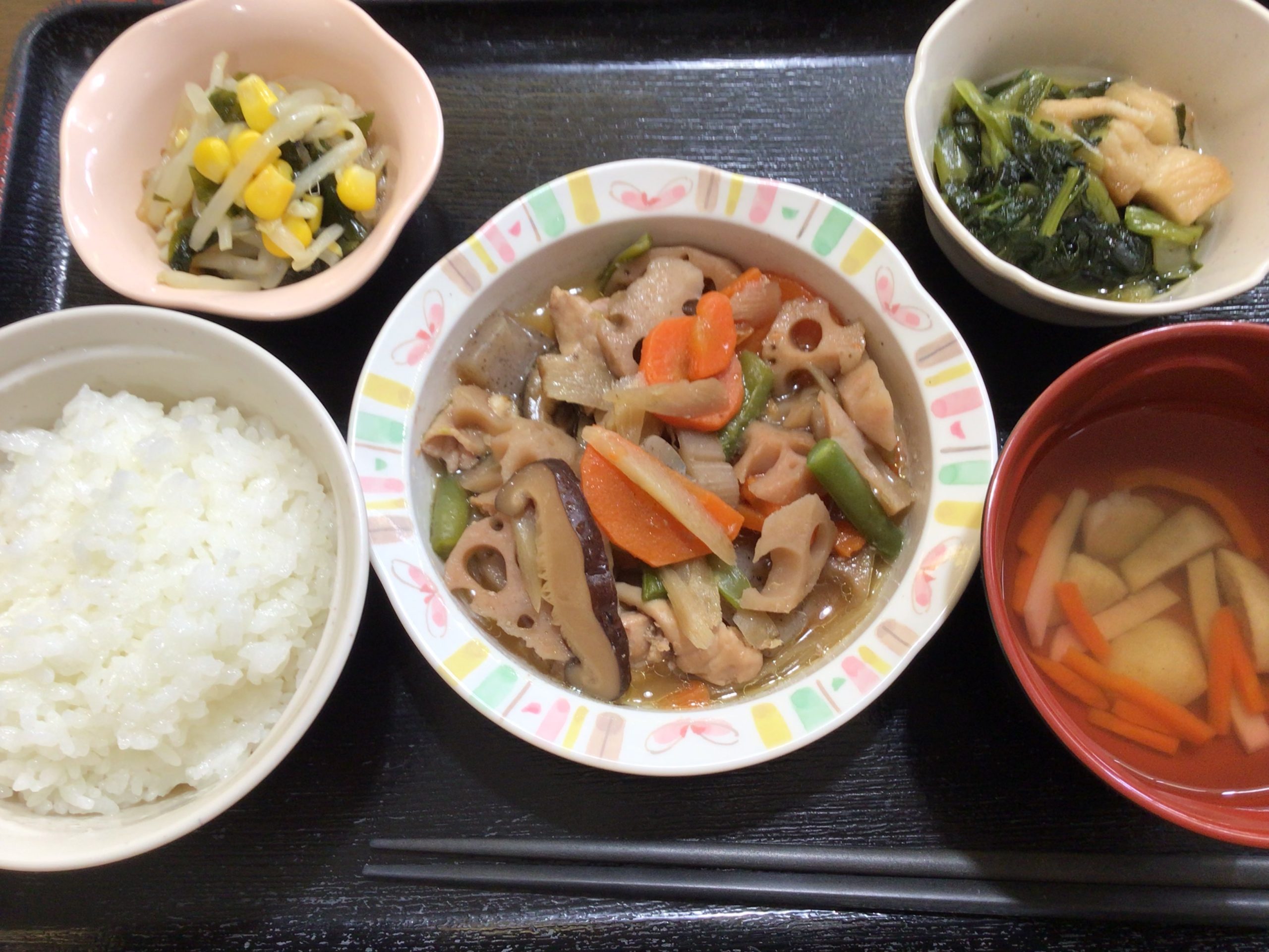 【昼食】 1.ご飯 2.炒り鶏 3.麩と小松菜煮 4.海藻サラダ 5.すまし汁