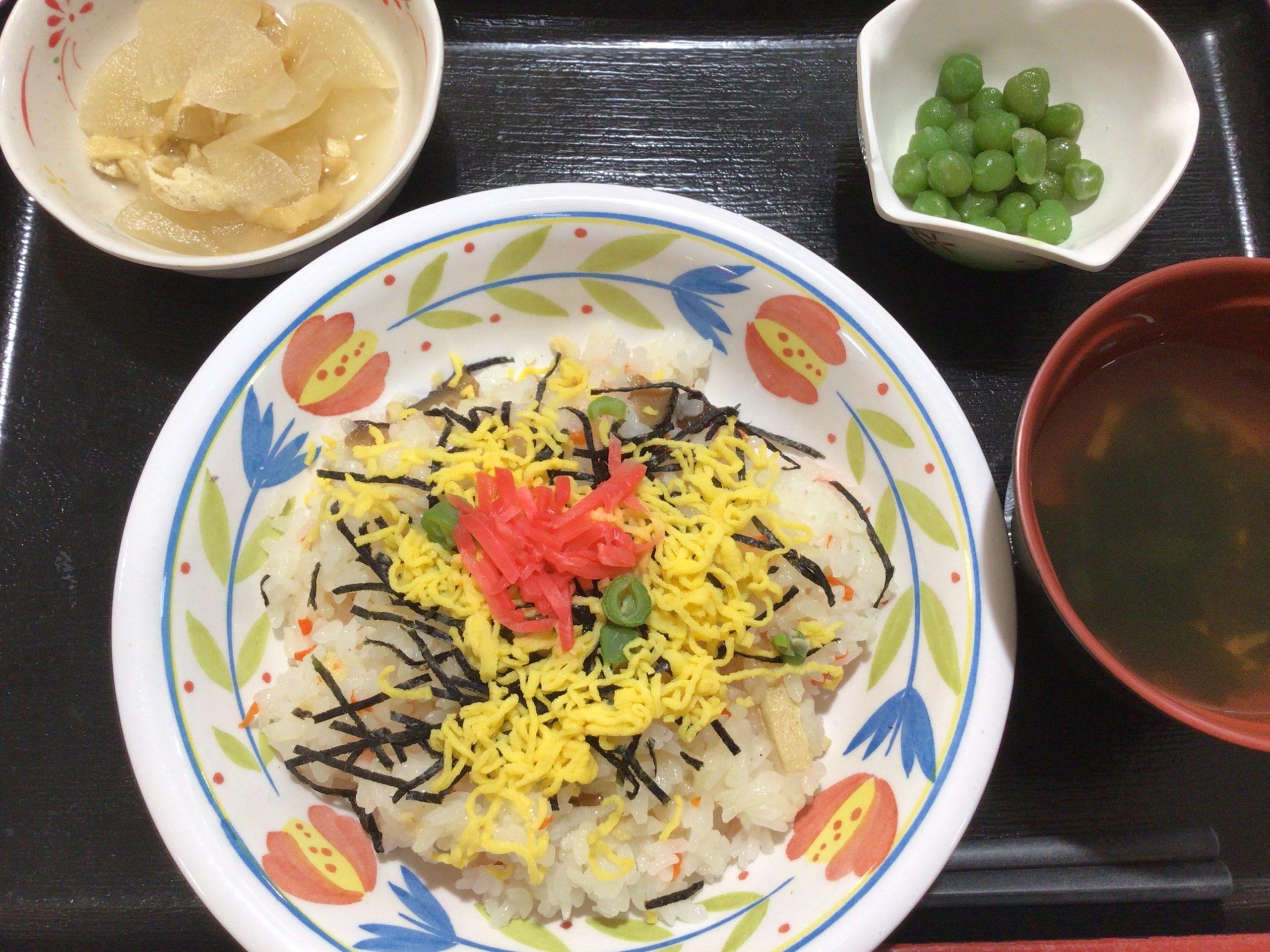 【昼食】 1.五目ちらし寿司 2.大根の煮物 3.うぐいす豆 4.すまし汁