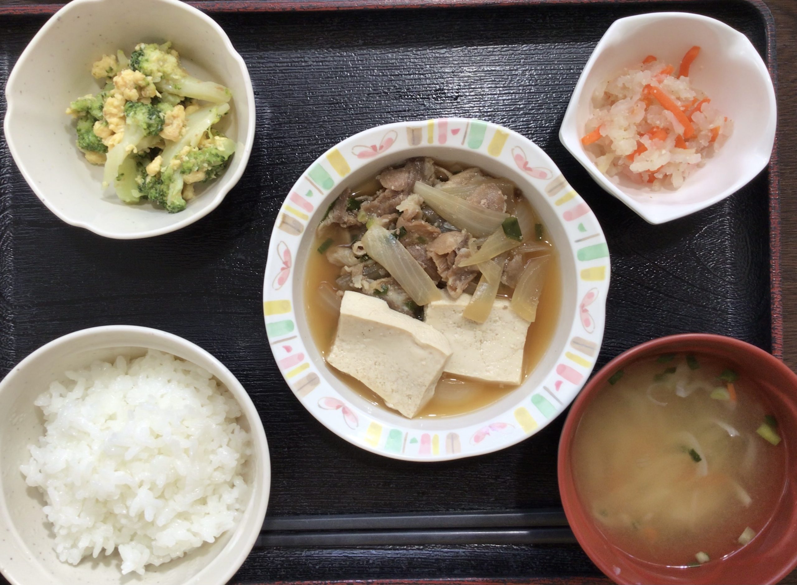 【昼食】 1.ご飯 2.肉豆腐 3.ブロッコリーと卵のサラダ 4.切り干し大根なます 5.みそ汁