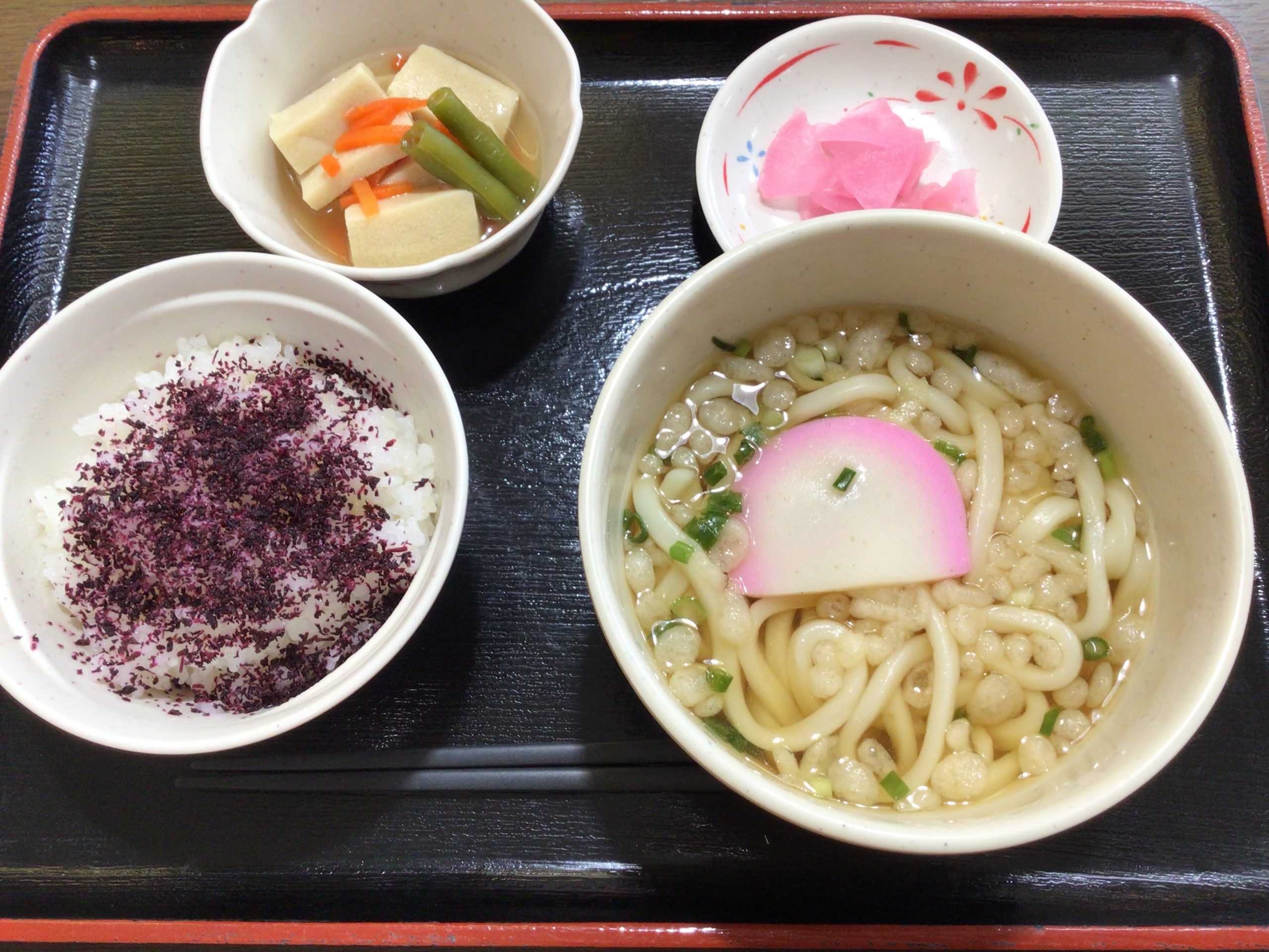 【昼食】 1.ゆかりご飯(小) 2.ハイカラうどん 3.高野豆腐の煮物 4.漬物