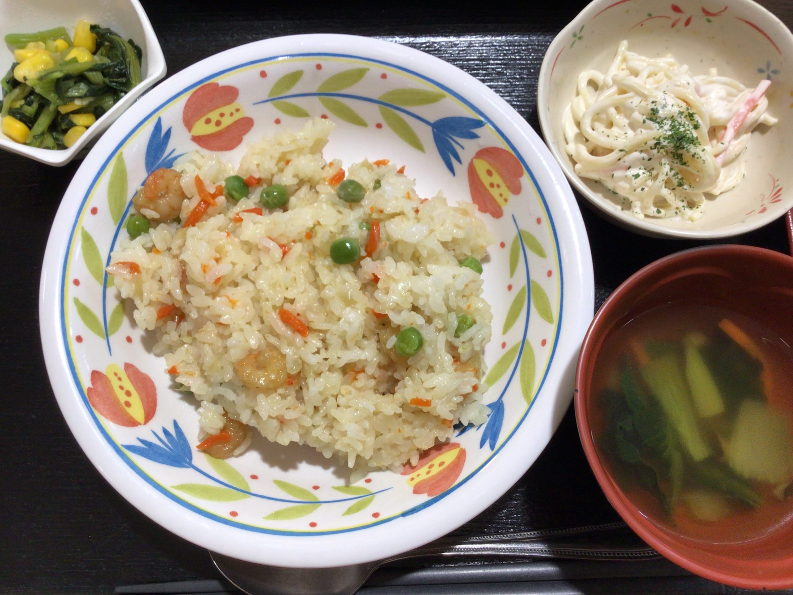 【昼食】 1.炊き込みエビピラフ 2.スパゲティサラダ 3.青菜炒め 4.コンソメスープ