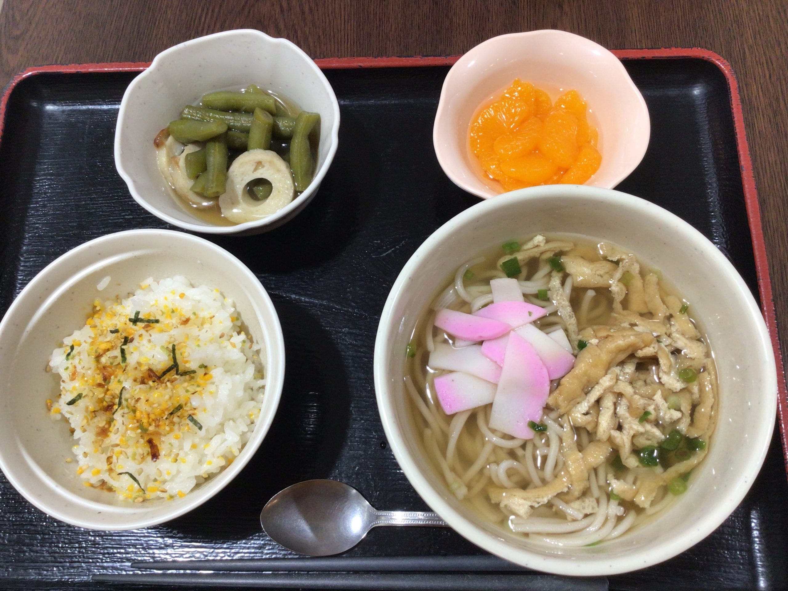 【昼食】 1.ふりかけご飯(小) 2.きざみそば 3.いんげんと竹輪の煮物 4.フルーツ缶