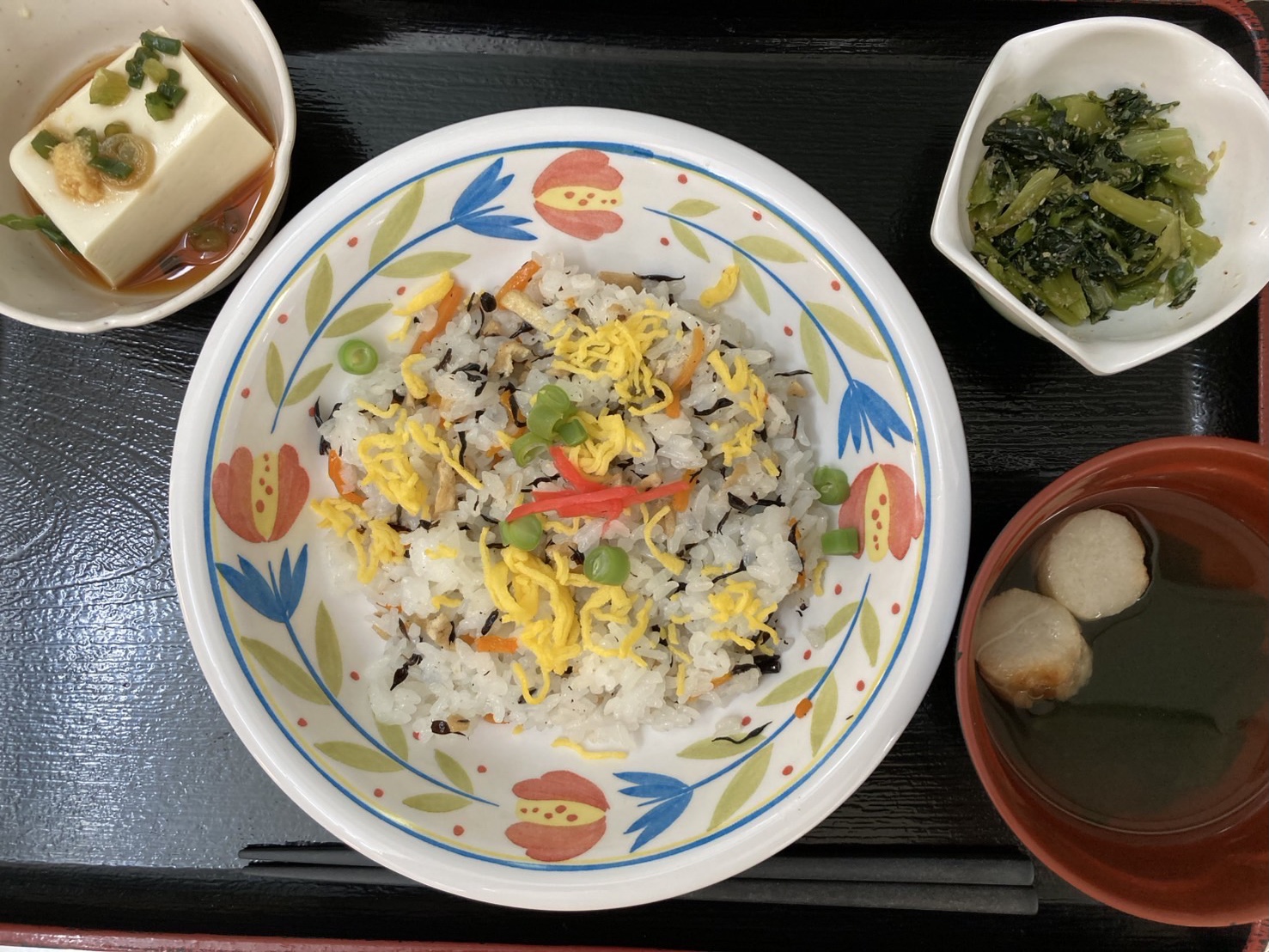 【昼食】 1.ひじきチラシ寿司 2.奴 3.青菜のごま和え 4.すまし汁