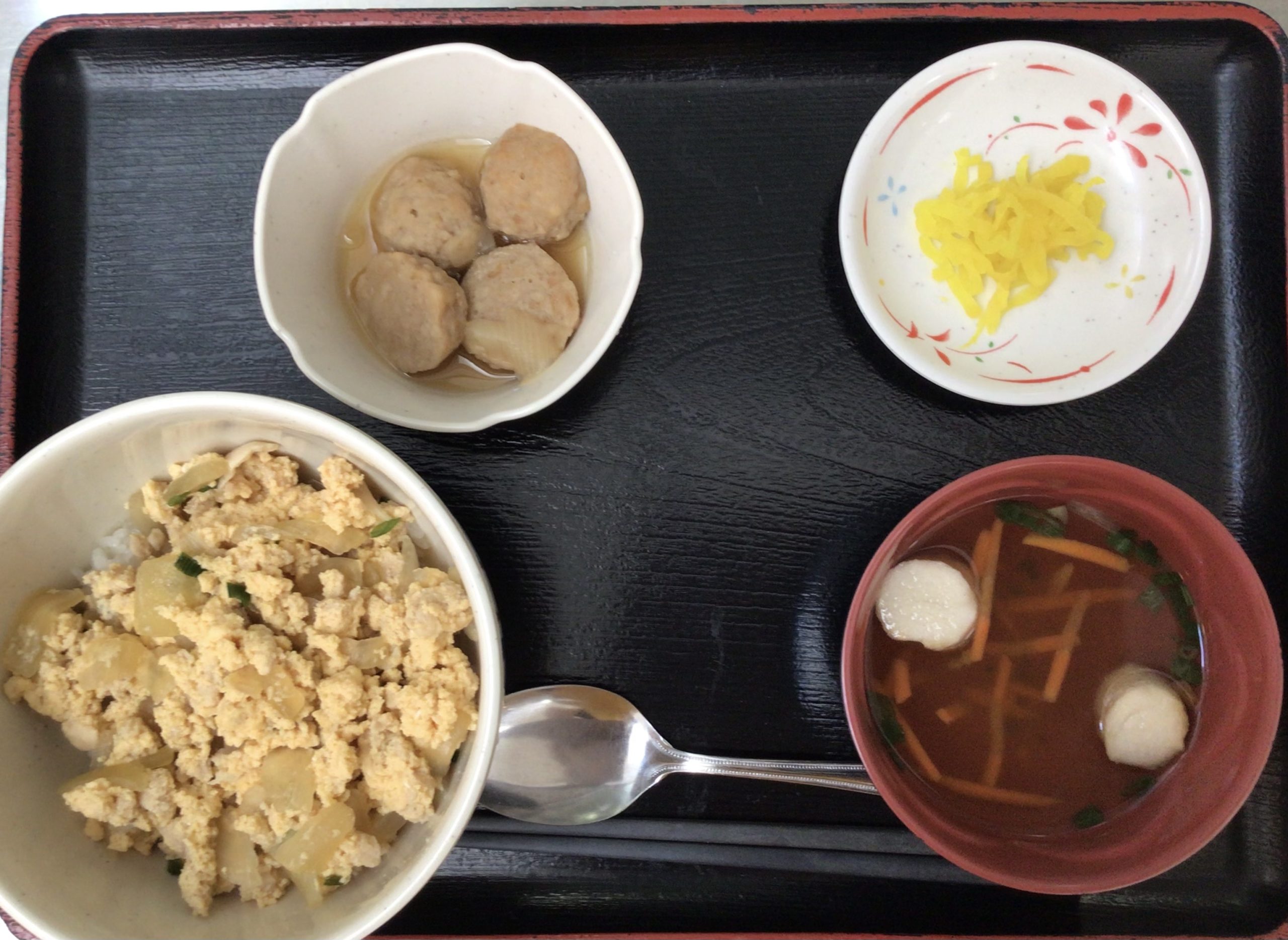 【昼食】 1.甘辛ミンチの卵とじ丼 2.肉団子甘煮 3.漬物 4.すまし汁
