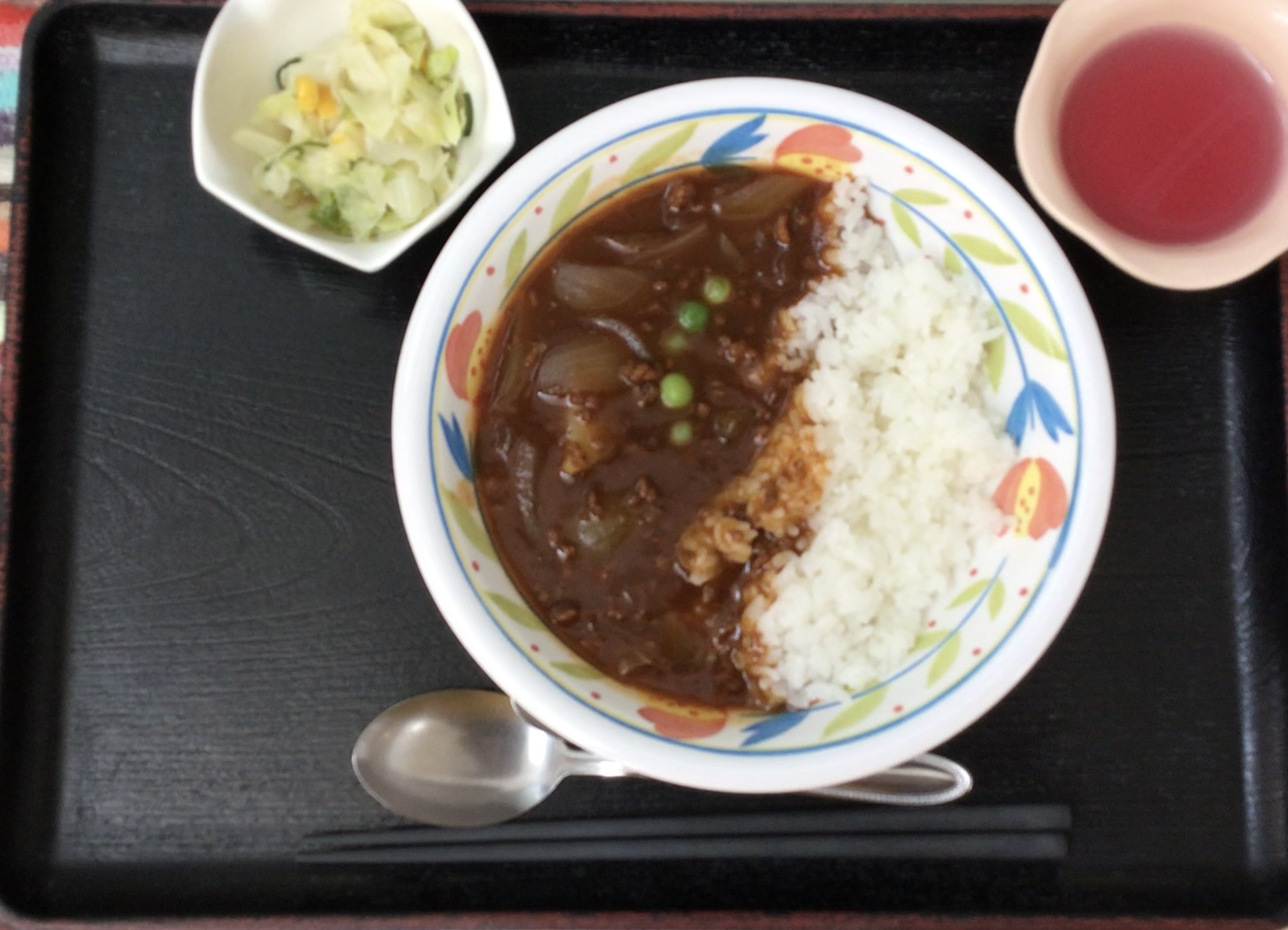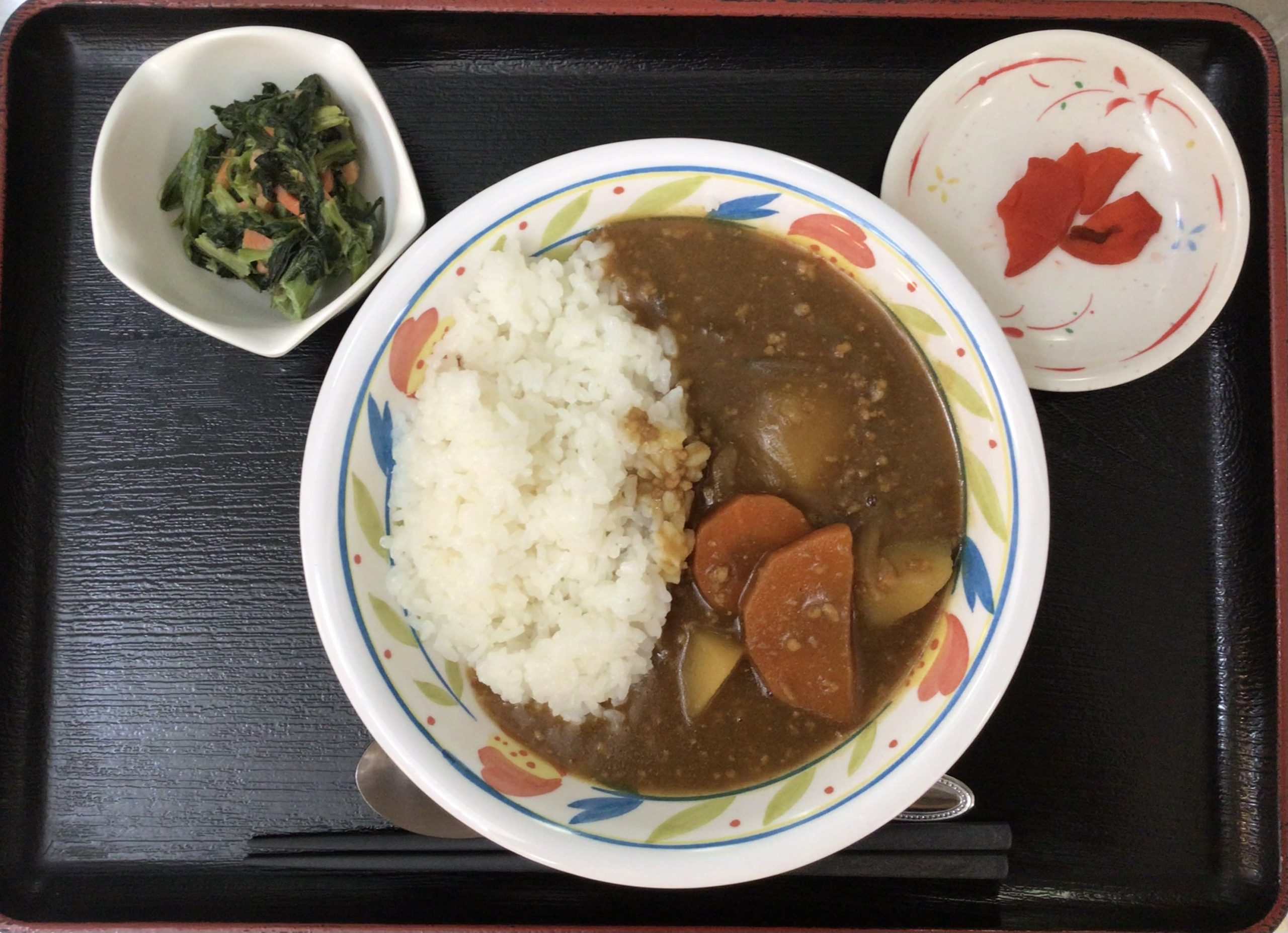 【昼食】 1.カレーライス 2.ポパイサラダ 3.福神漬け