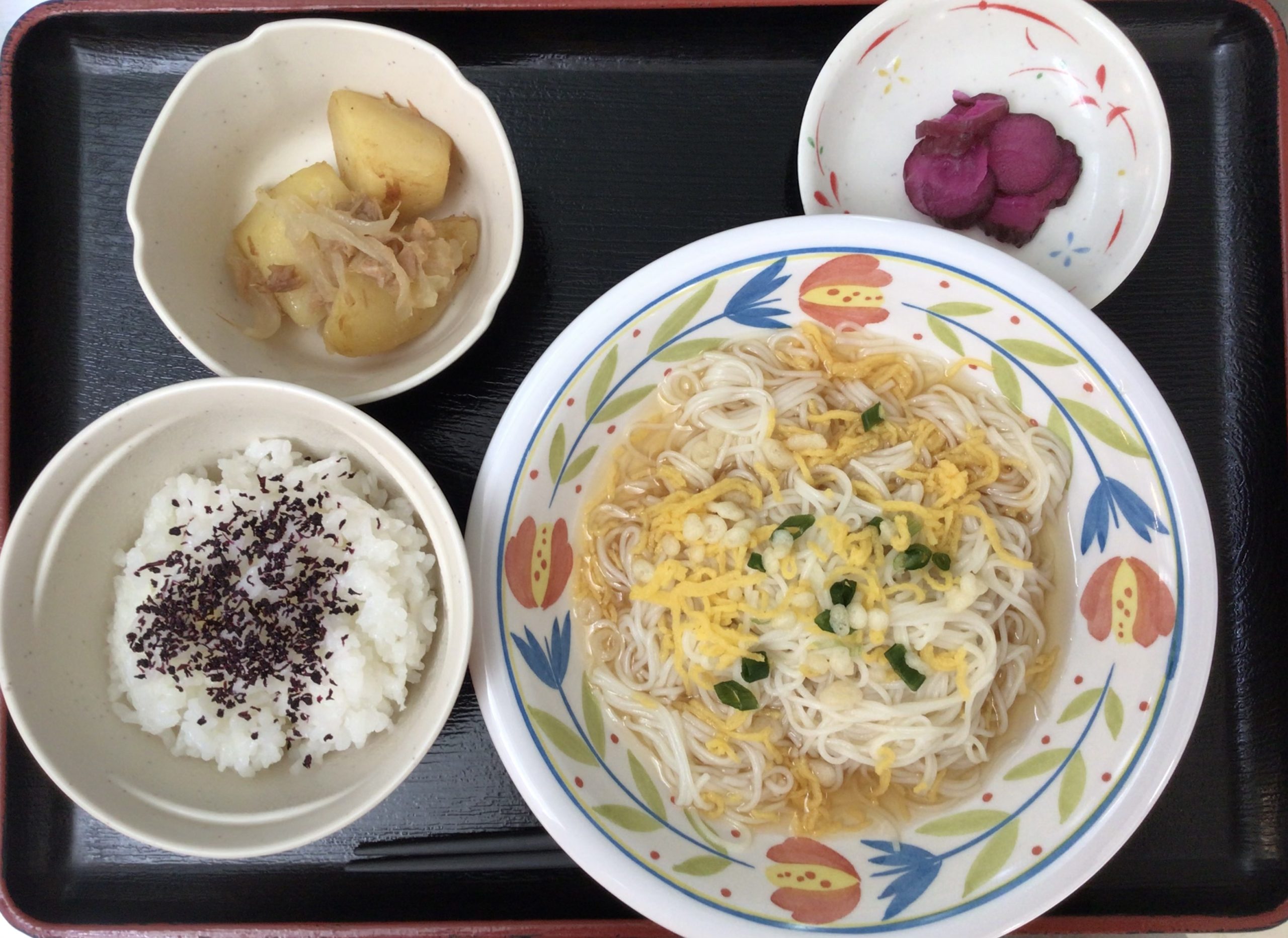【昼食】 1.ゆかりご飯 2.ぶっかけそうめん 3.ツナじゃが炒め煮 4.漬物