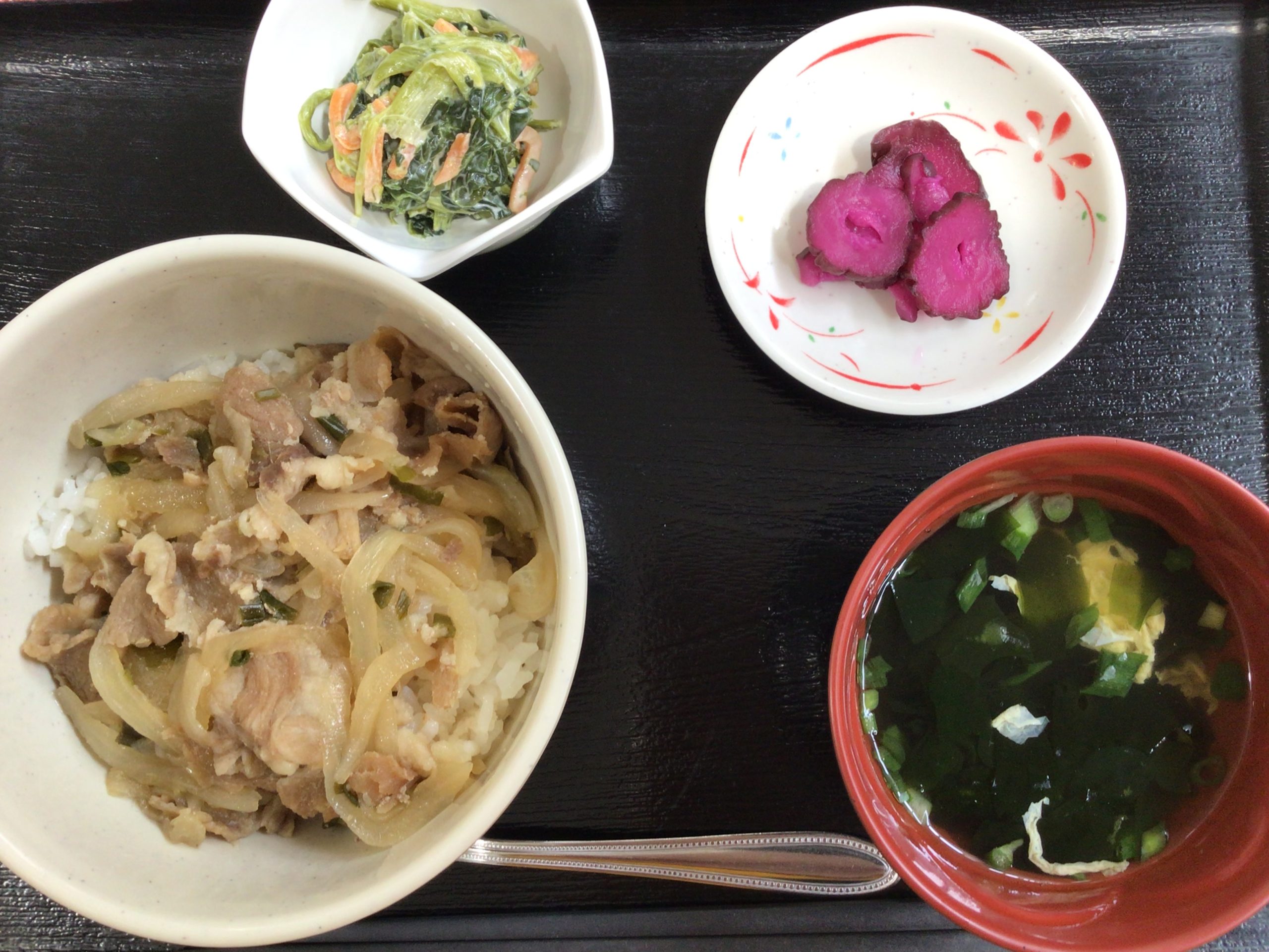 【昼食】 1.豚丼 2.ほうれん草マヨネーズ和え 3.漬物 4.すまし汁