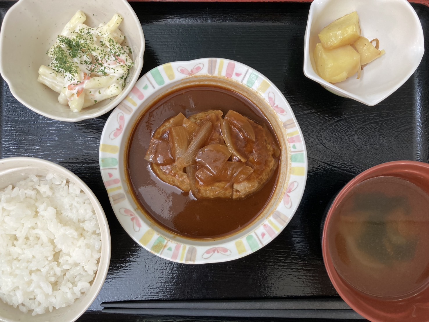 【昼食】 1.米飯 2.煮込みハンバーグ 3.マカロニサラダ 4.じゃがいもソテー 5.コンソメスープ