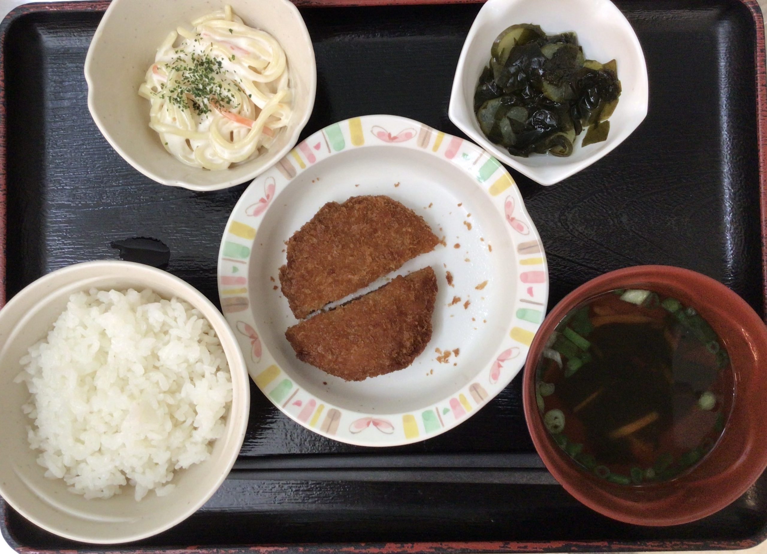 【昼食】 1.米飯 2.ミンチカツ 3.スパゲティサラダ 4.胡瓜とワカメの酢の物 5.すまし汁