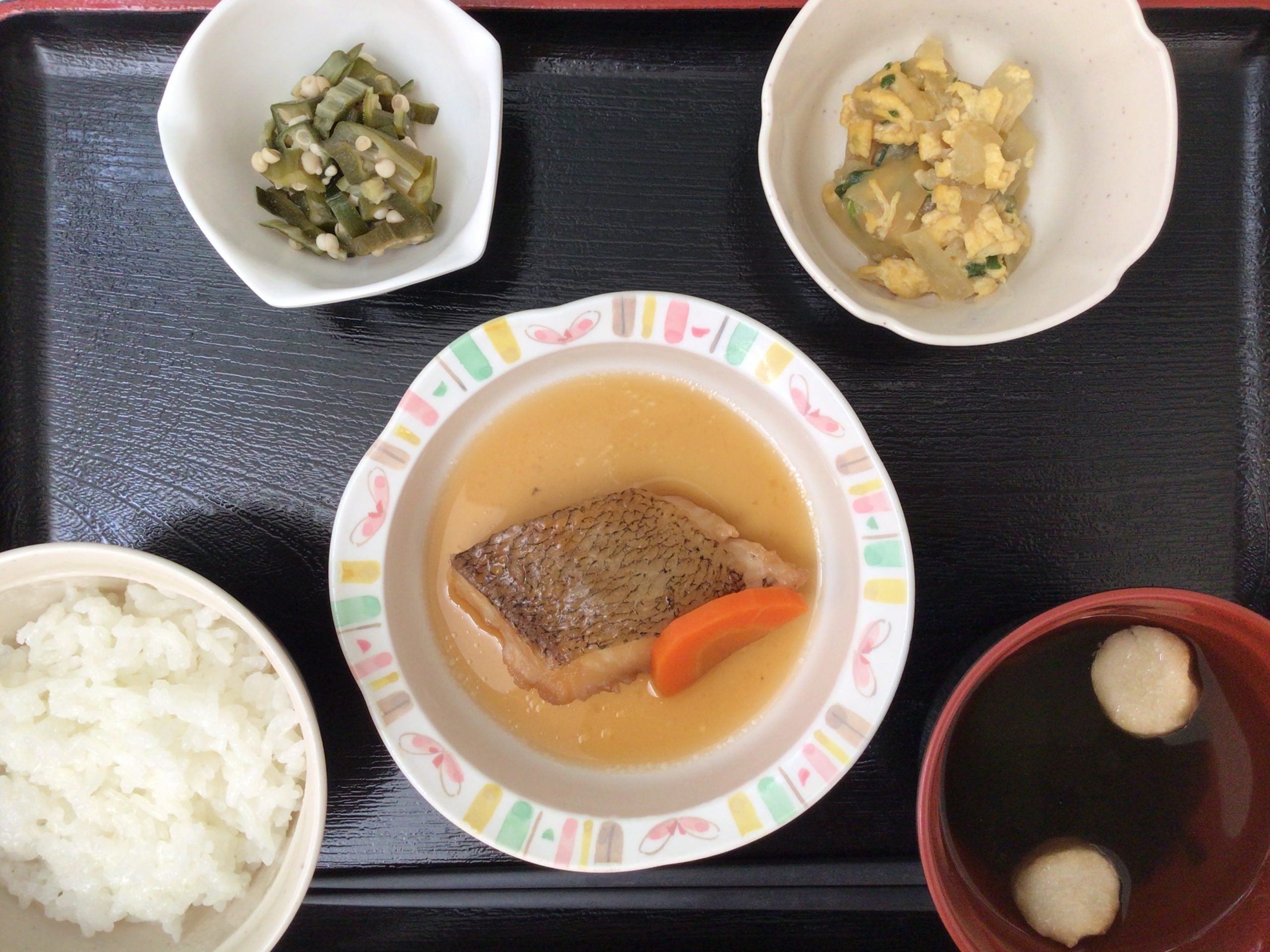 【昼食】 1.米飯 2.煮魚 3.ねぎ玉 4.おくらポン酢 5.すまし汁