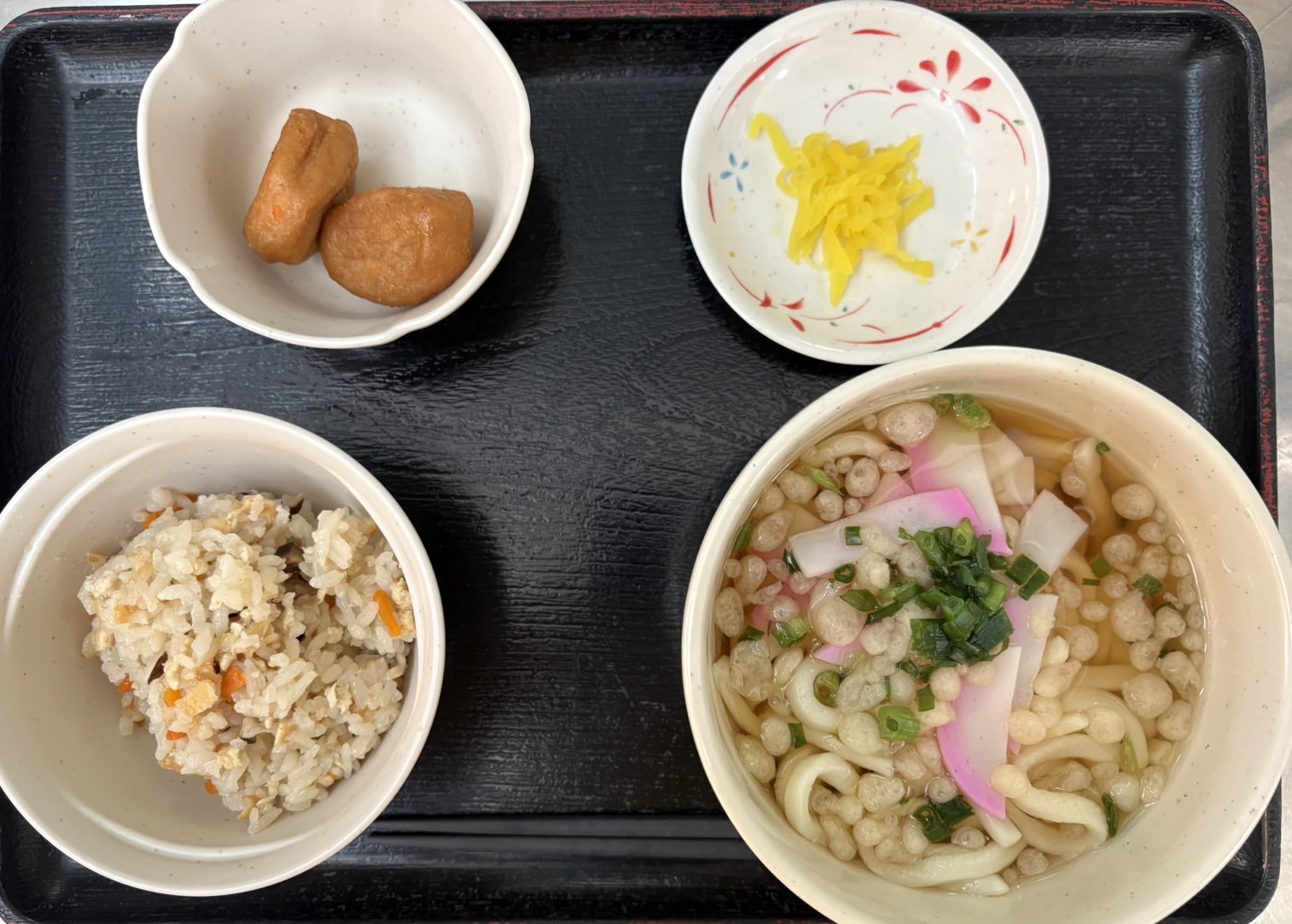 【昼食】 1.かやくご飯(小) 2.ハイカラうどん 3.がんも煮 4.漬物