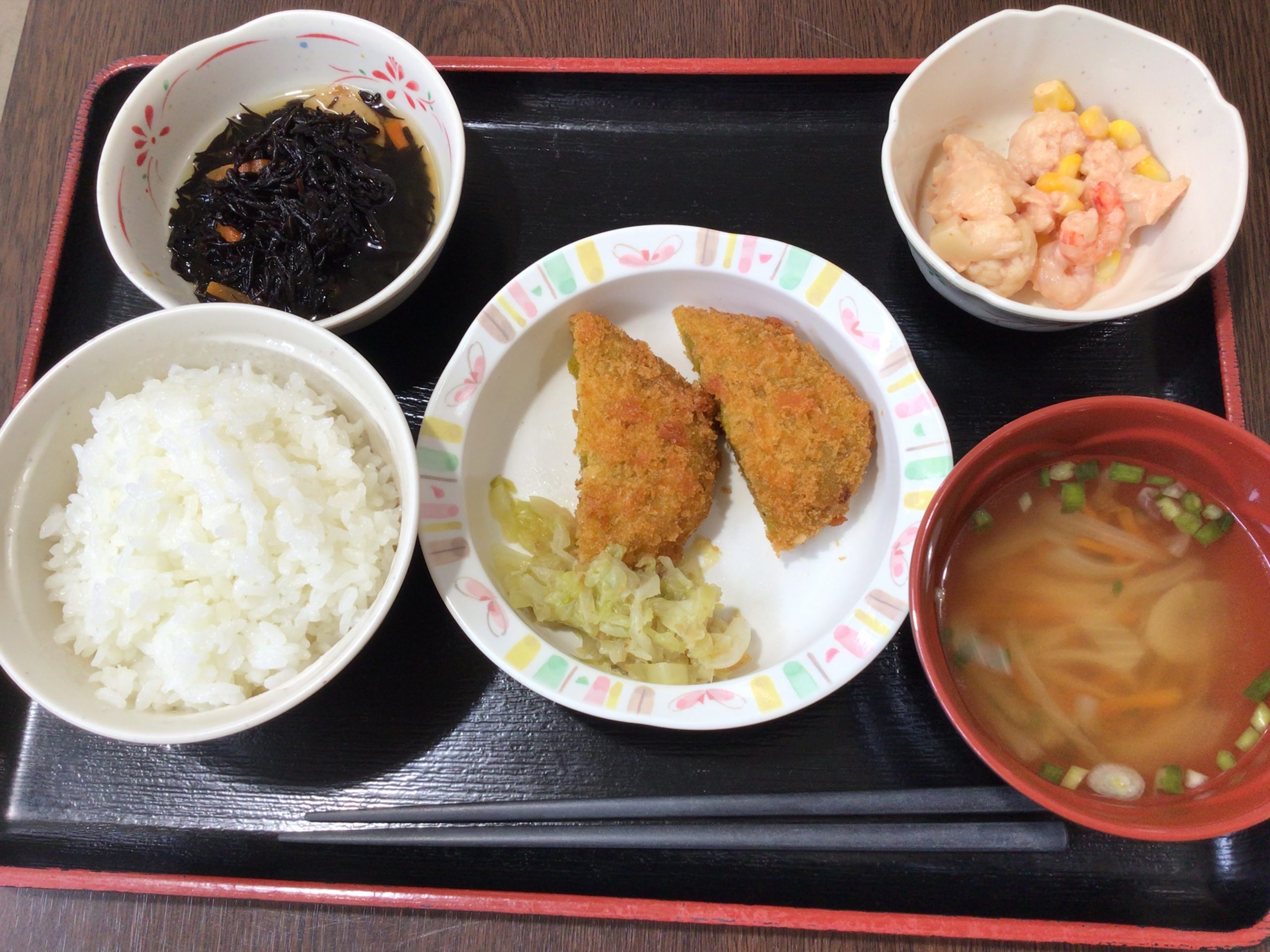【昼食】 1.ご飯 2.かぼちゃコロッケ ボイルキャベツ添 3.オーロラサラダ 4.ひじき煮 5.コンソメスープ