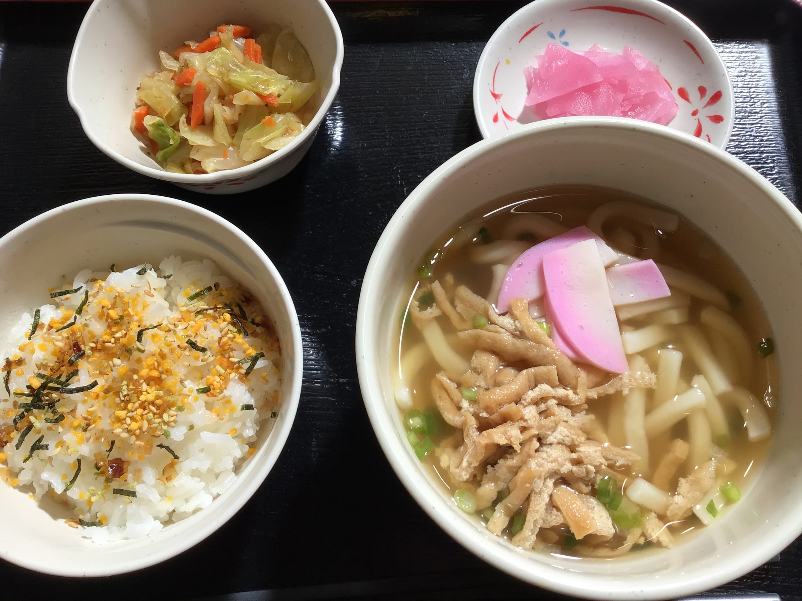 【昼食】 1.ふりかけご飯(小) 2.きつねうどん 3.キャベツのおかか和え 4.漬物