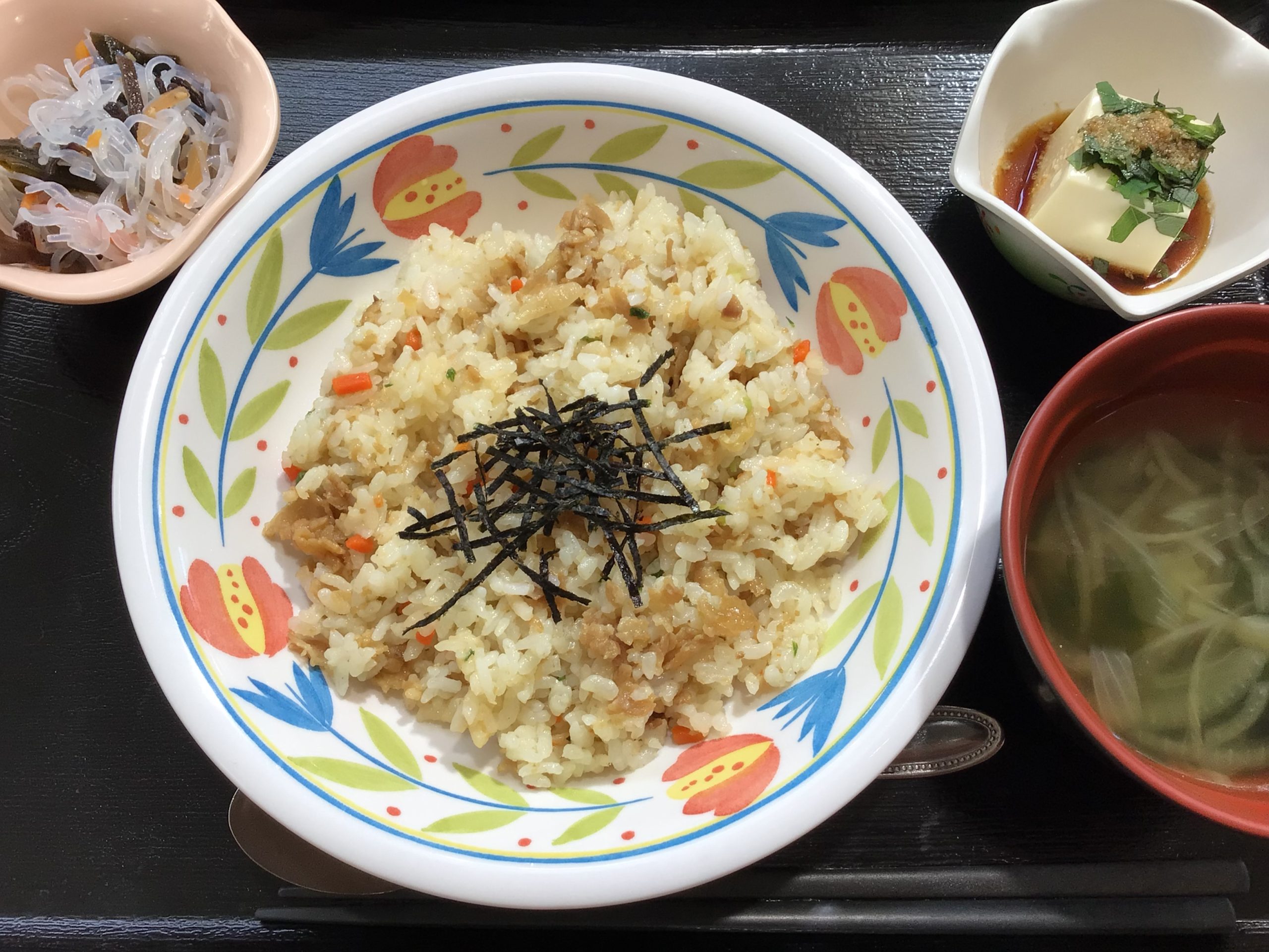 【昼食】 1.キンパ風まぜご飯 2.中華春雨サラダ 3.薬味やっこ 4.中華風スープ
