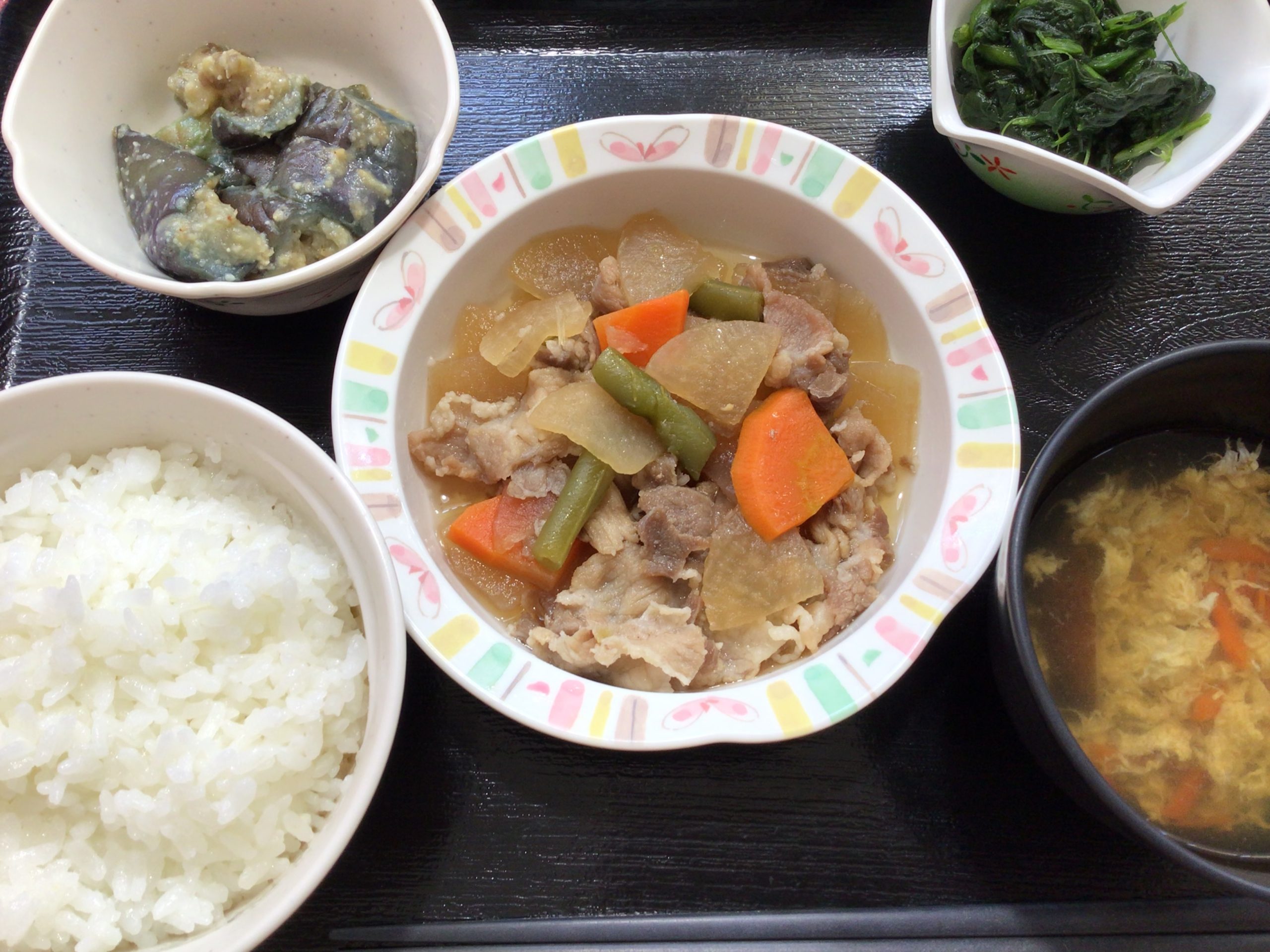 【昼食】 1.ご飯 2.豚と大根の煮物 3.茄子のごま味噌和え 4.ほうれん草のお浸し 5.すまし汁