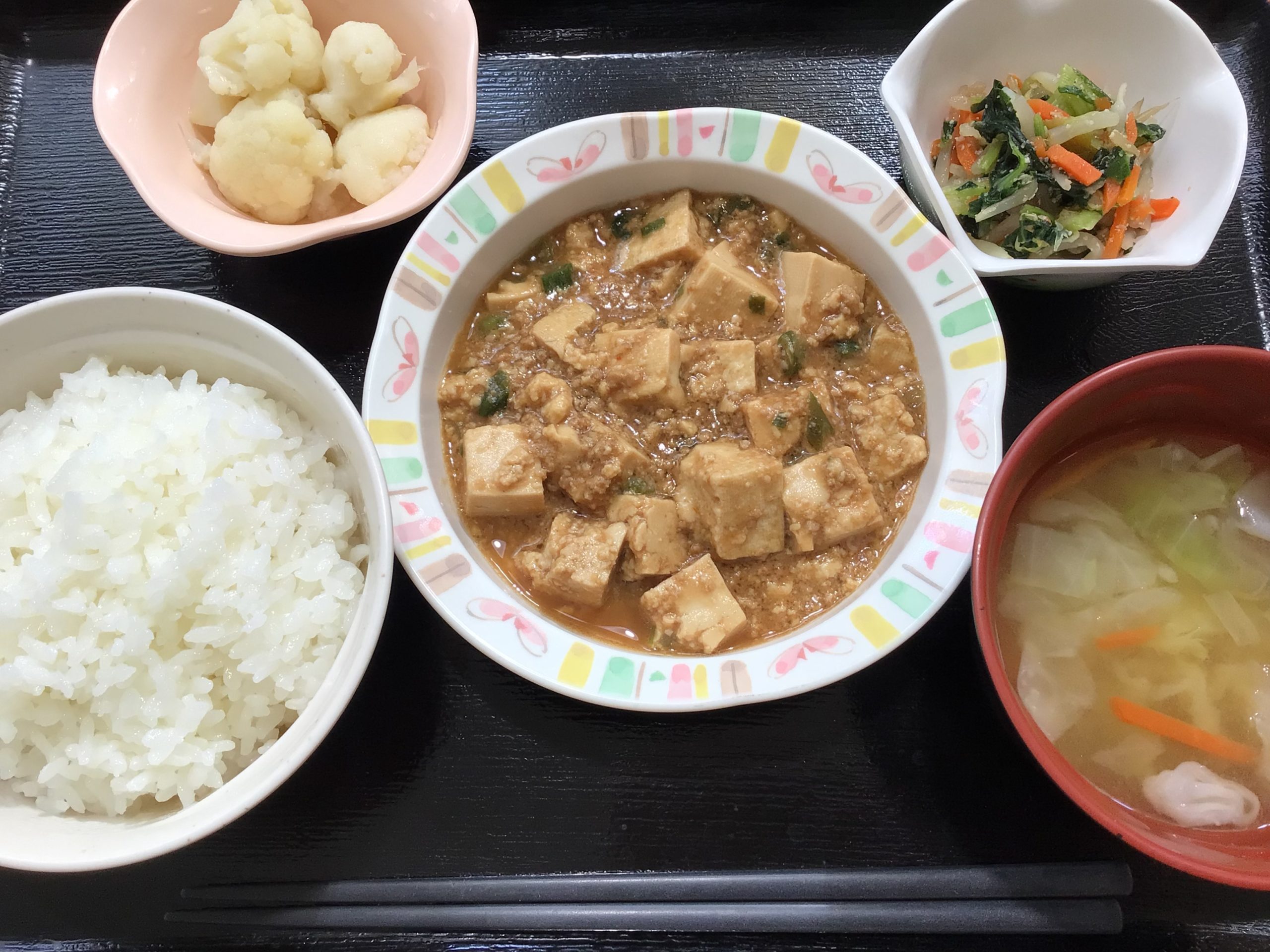 【昼食】 1.ご飯 2.麻婆豆腐 3.もやしナムル 4.カリフラワーの甘酢和え 5.みそ汁