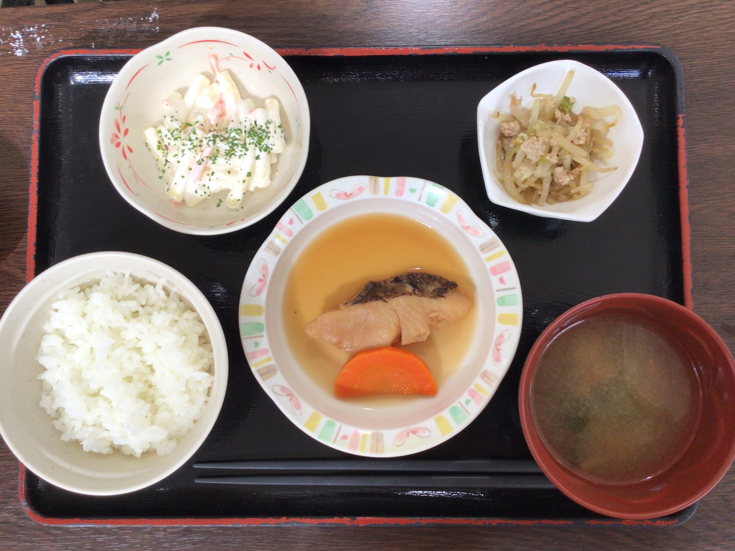 【昼食】 1.ご飯 2.カレイ煮魚 3.マカロニサラダ 4.もやしのひき肉炒め 5.みそ汁