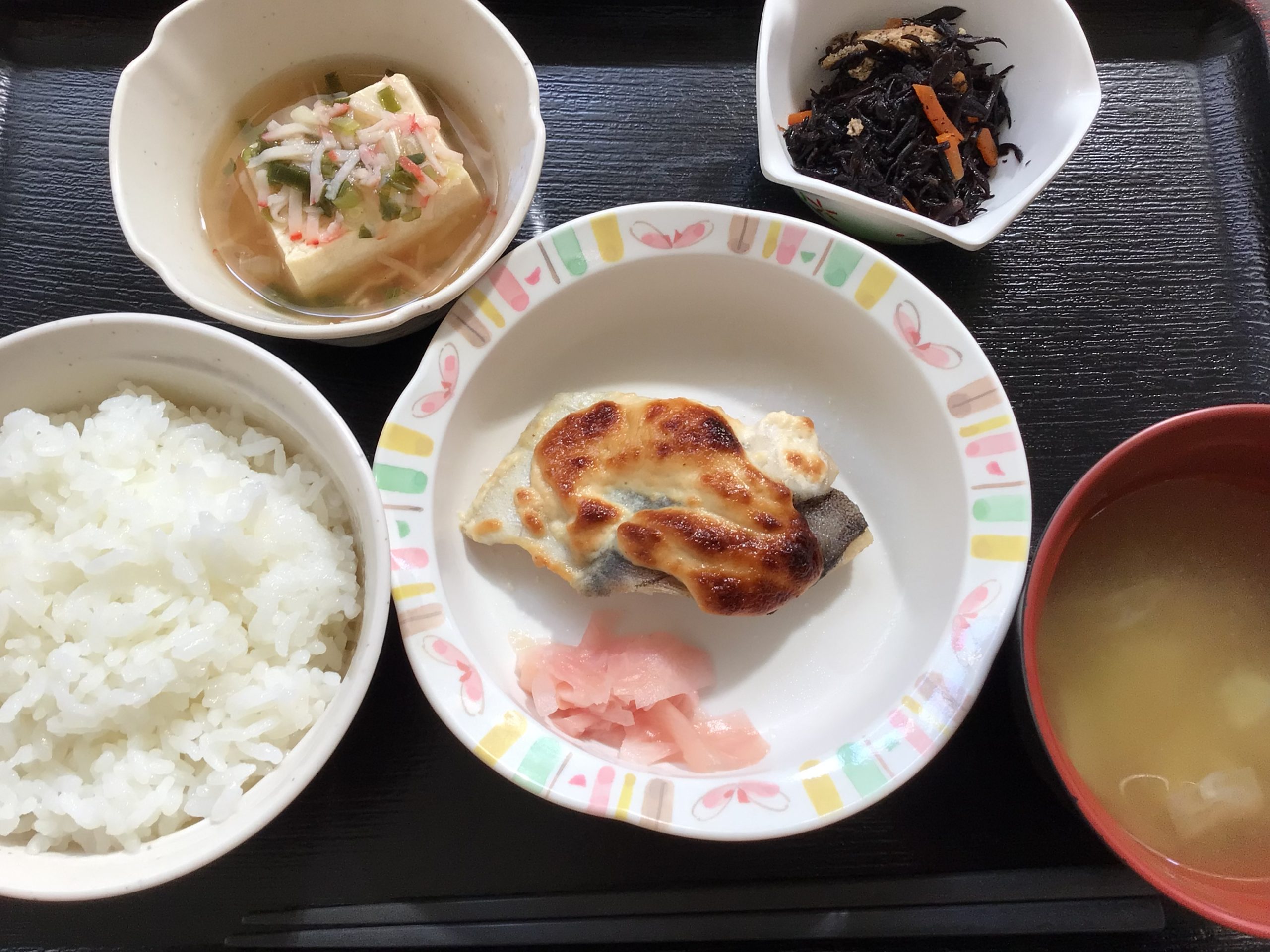 【昼食】 1.ご飯 2.白身魚の味噌マヨネーズ焼き 3.温奴のかにあんかけ 4.ひじき煮 5.みそ汁