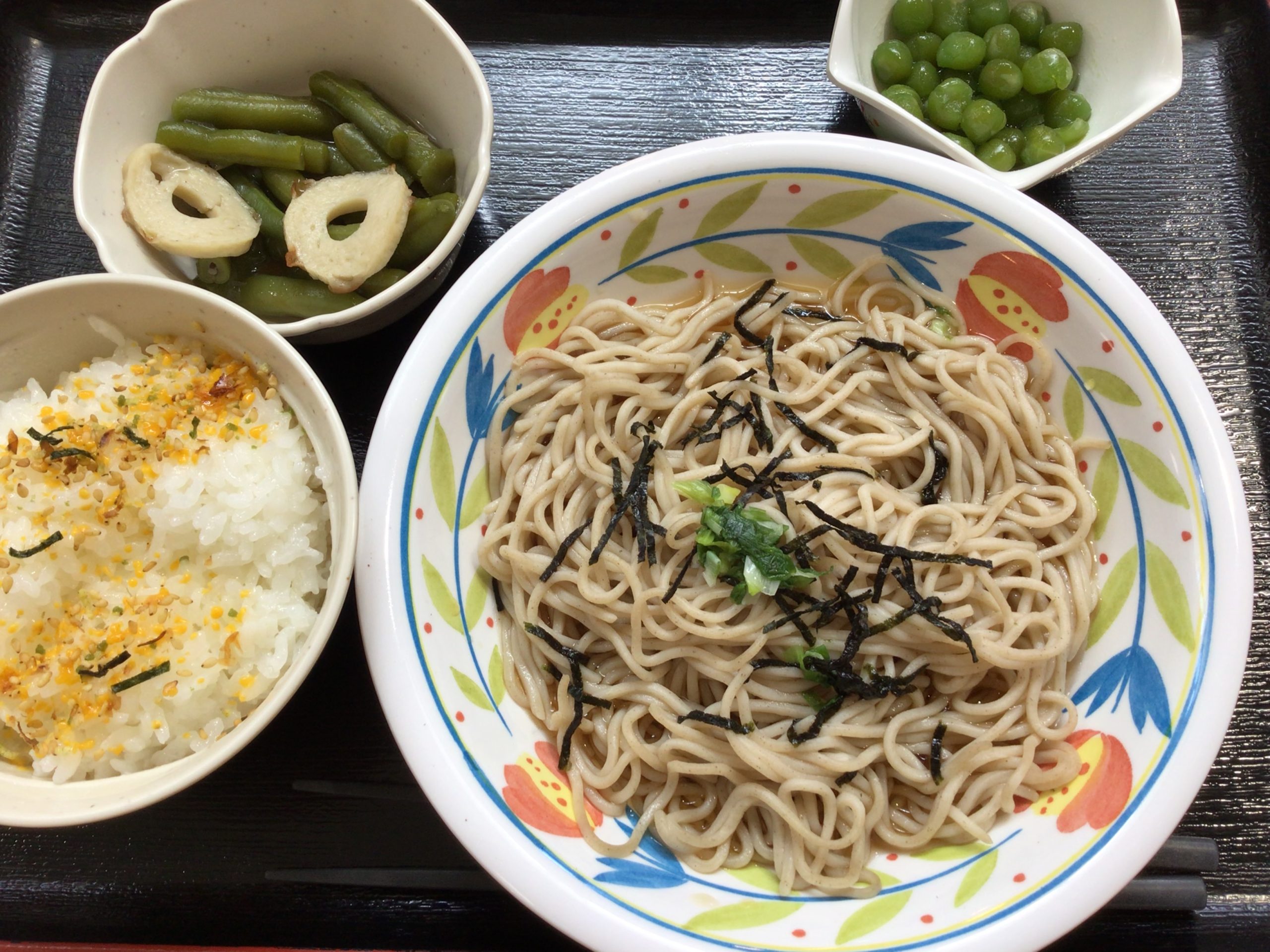 【昼食】 1.ふりかけご飯(小) 2.ざるそば 3.いんげんの煮物 4.うぐいす豆