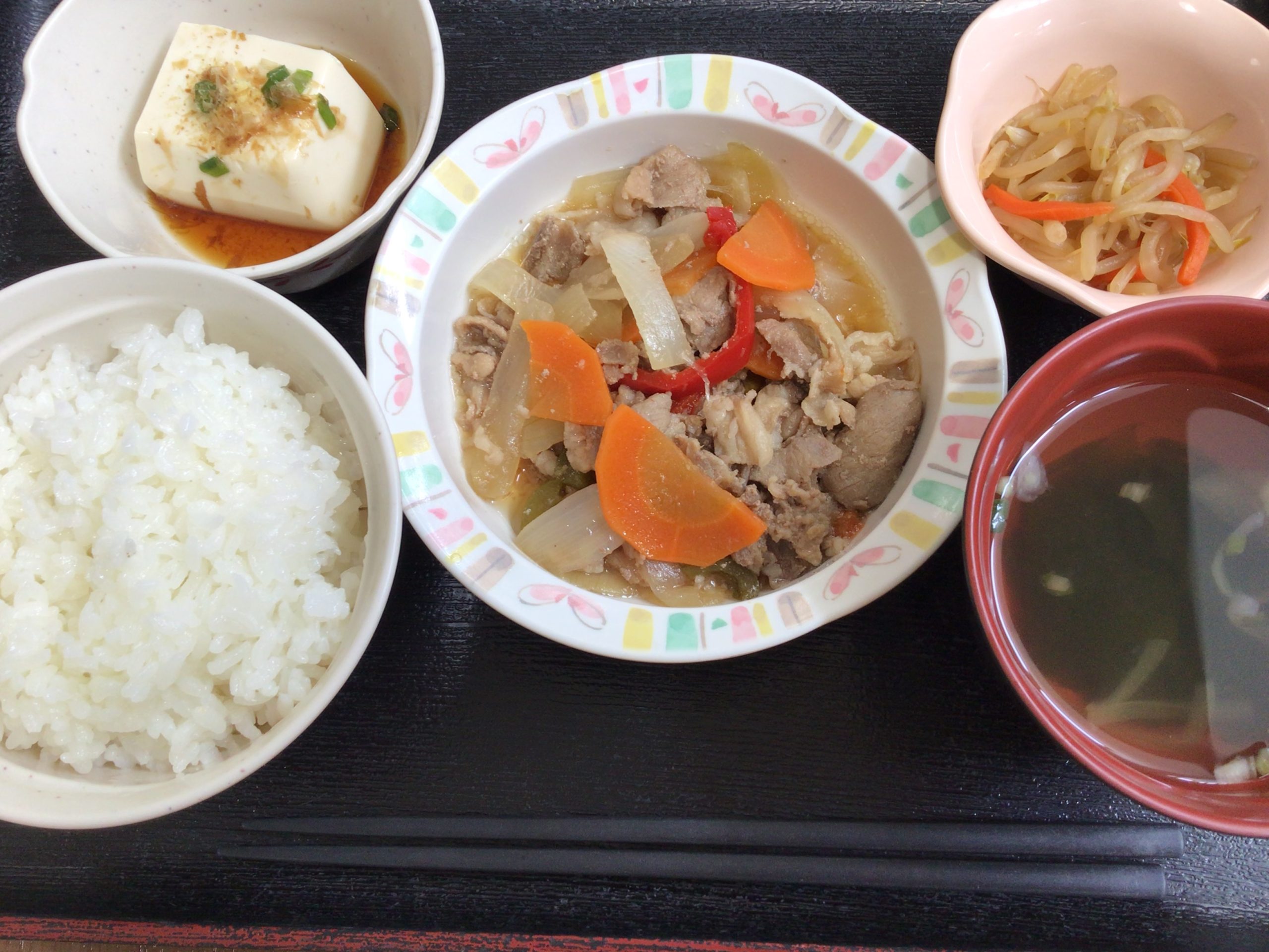 【昼食】 1.ご飯 2.豚肉の生姜炒め 3.冷奴 4.もやしお浸し 5.すまし汁