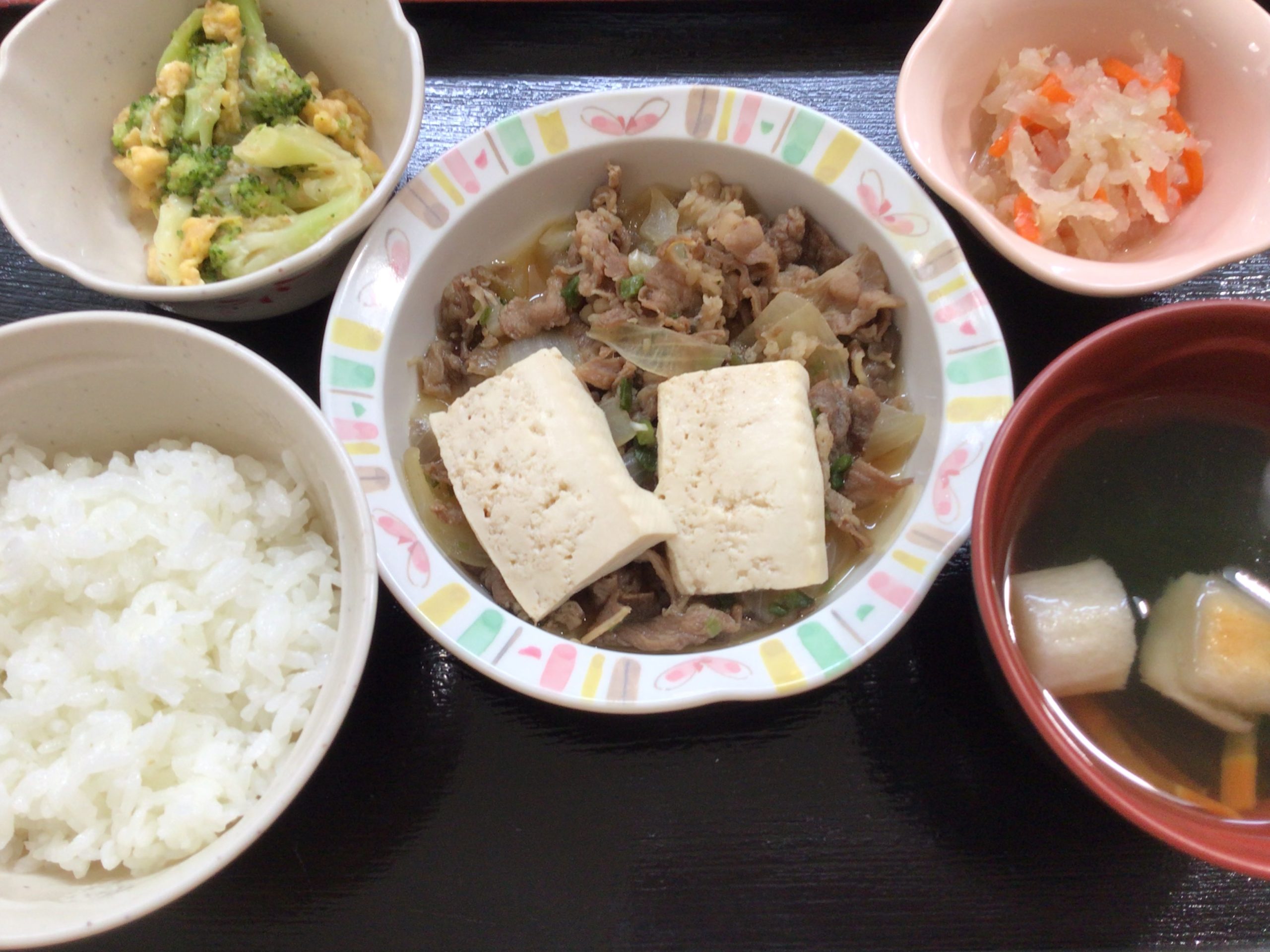 【昼食】 1.ご飯 2.肉豆腐 3.ブロッコリーと卵のサラダ 4.切り干し大根なます 5.すまし汁