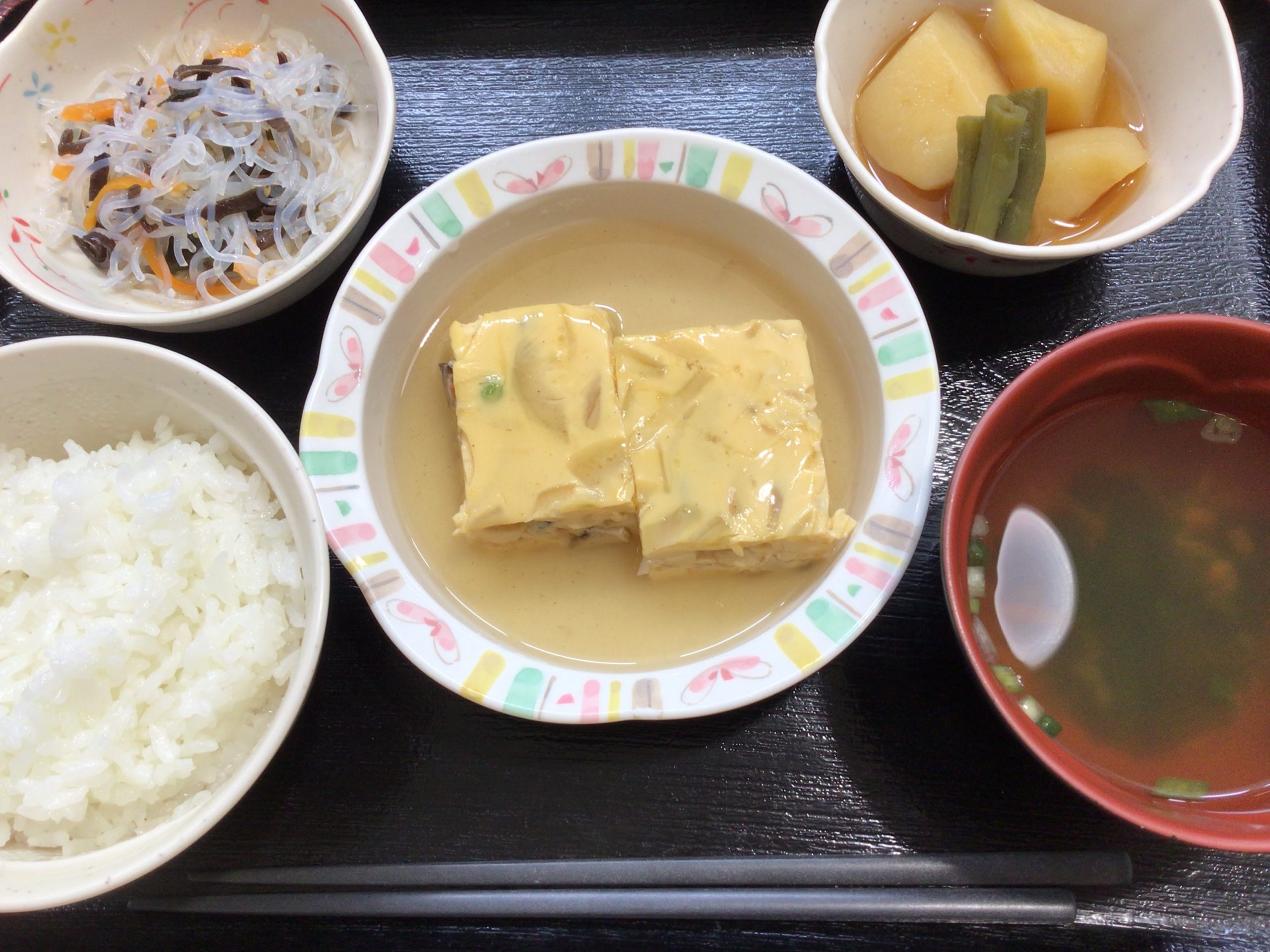 【昼食】 1.ご飯 2.かに玉風 3.じゃがいもの煮物 4.中華春雨サラダ 5.すまし汁