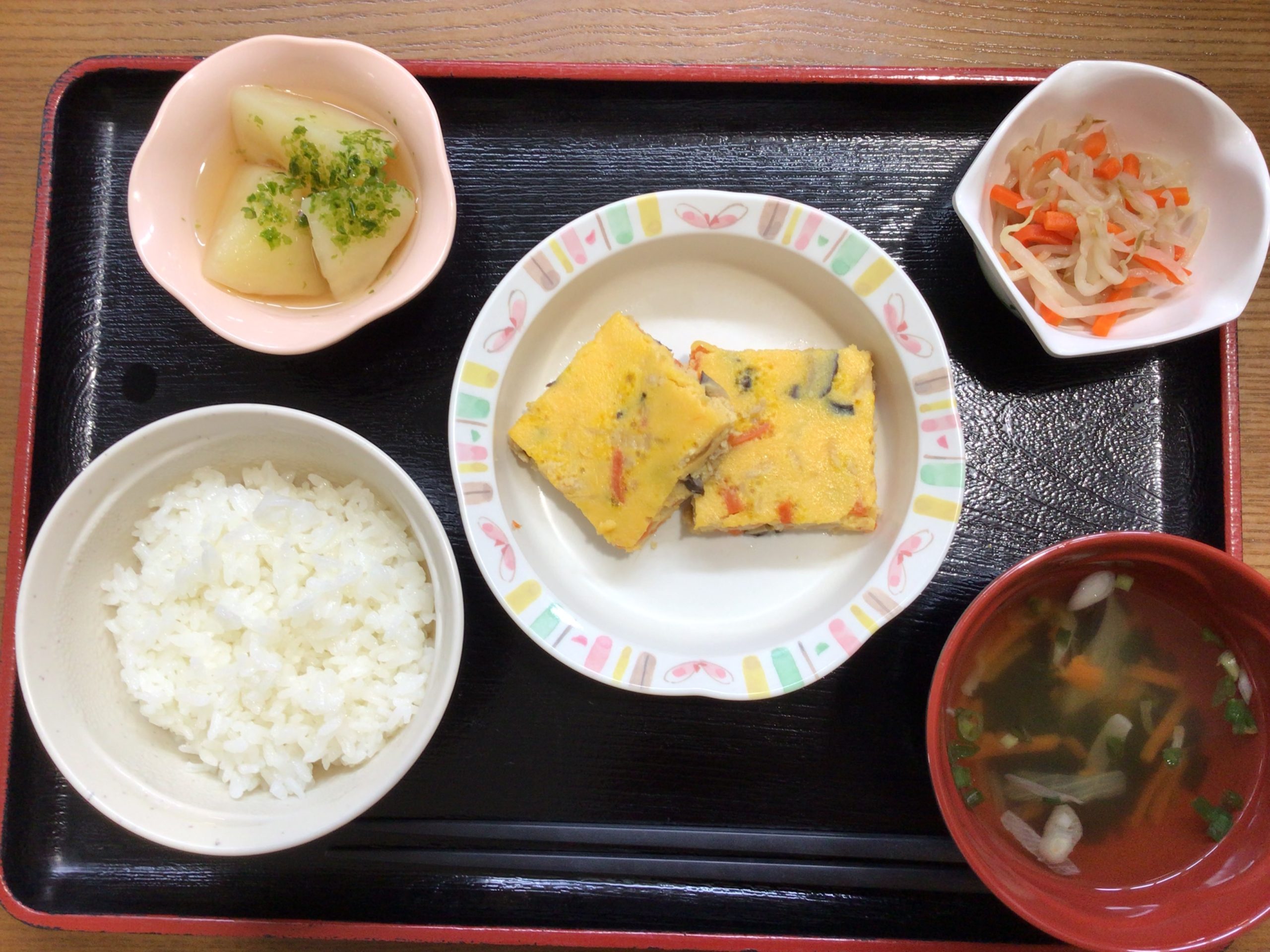 【昼食】 1.ご飯 2.千草焼き 3.じゃが芋のりまぶし 4.もやしの胡麻酢和え 5.すまし汁