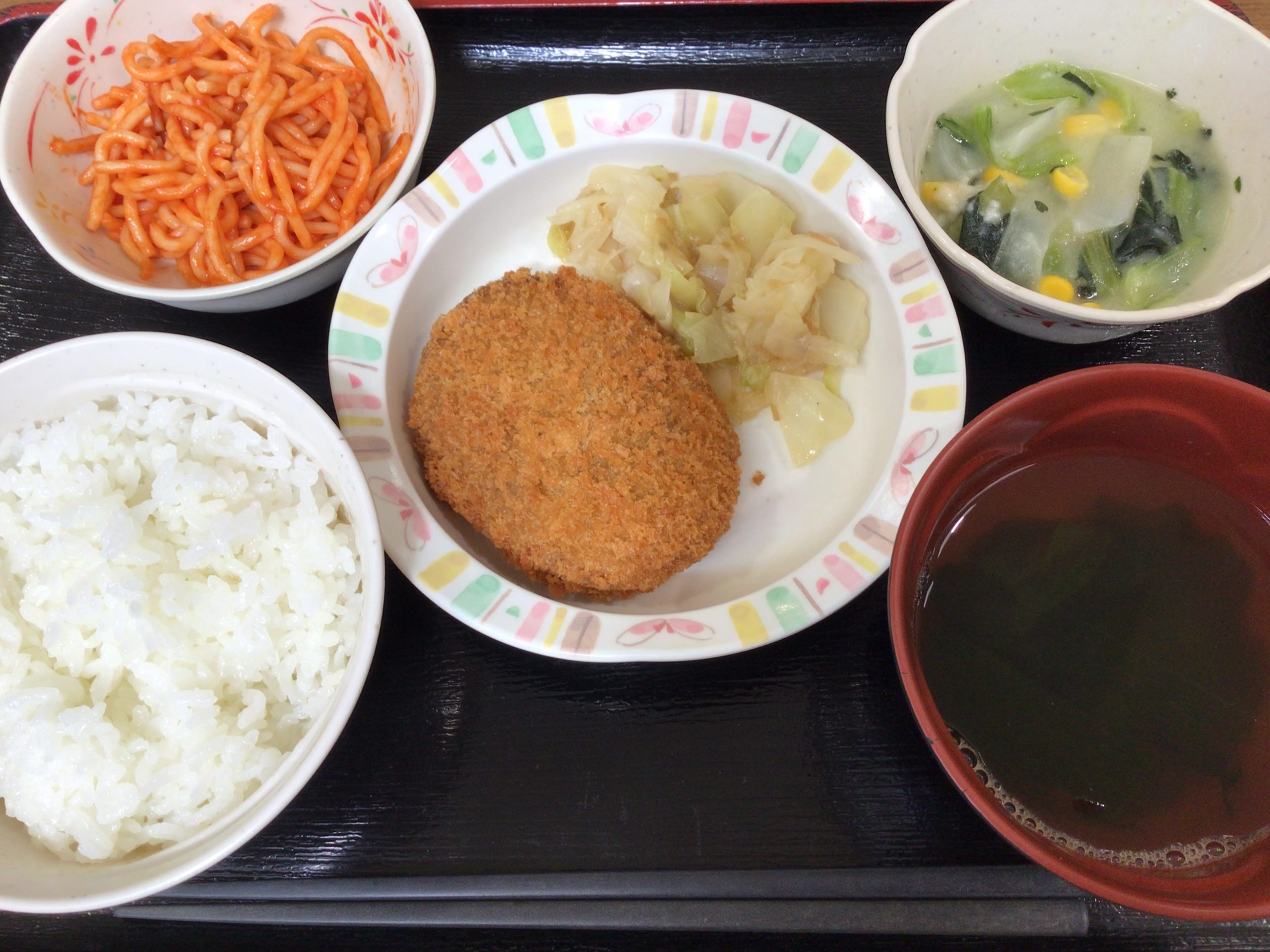 【昼食】 1.ご飯 2.コロッケ ボイルキャベツ添 3.青梗菜のクリーム煮 4.ナポリタン 5.すまし汁