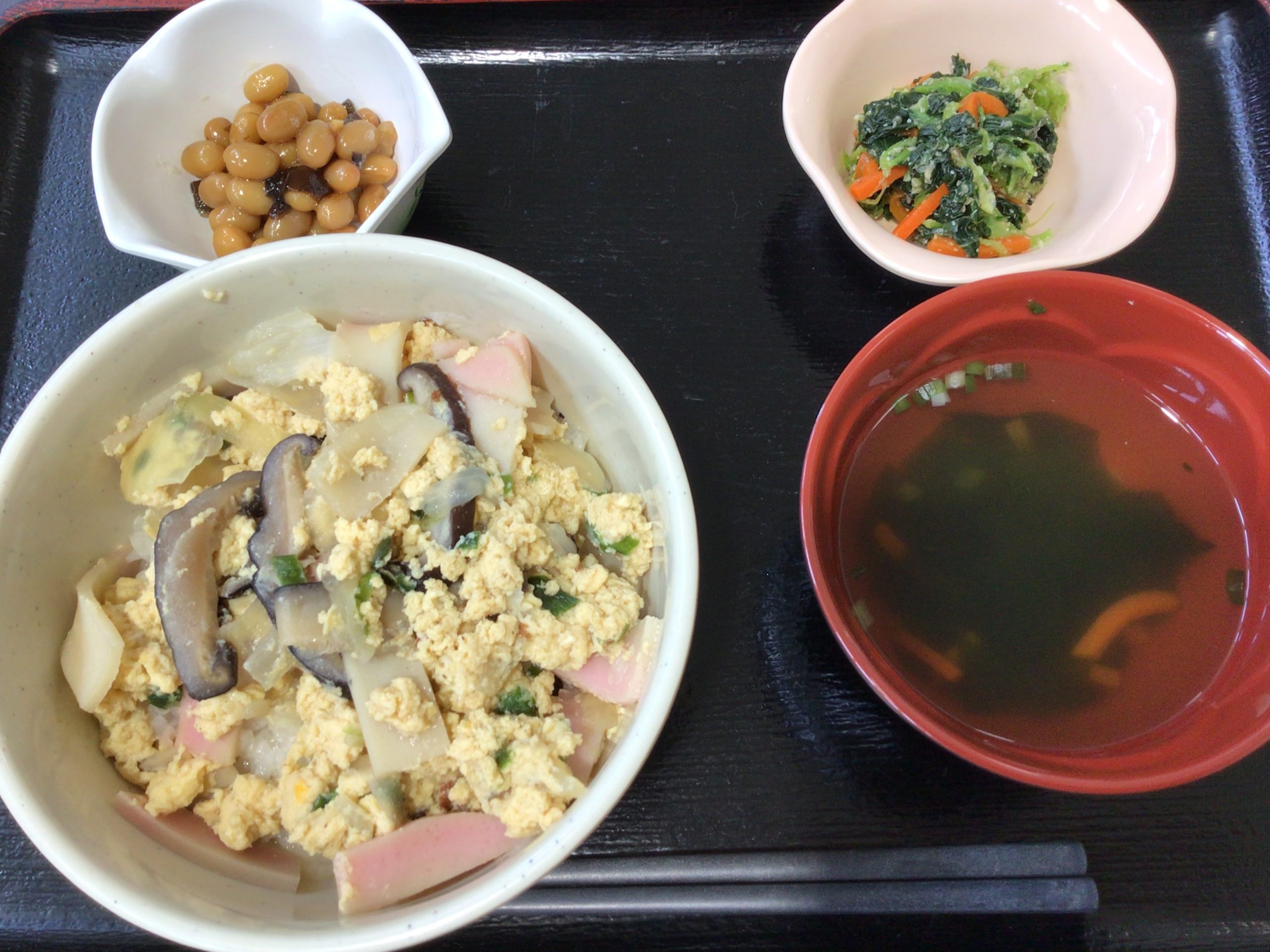 【昼食】 1.木の葉丼 2.小松菜のごま和え 3.やさい豆 4.すまし汁